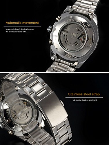 -. Title : GuTe Elegant Mens All Silver Steel Auto Mechaincal Wrist Watch Day & Date & 24hrs Luminous