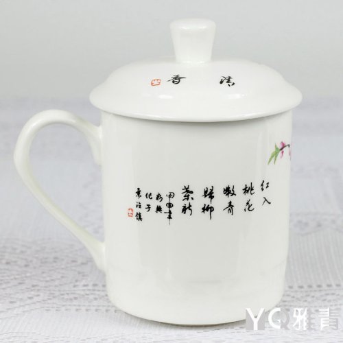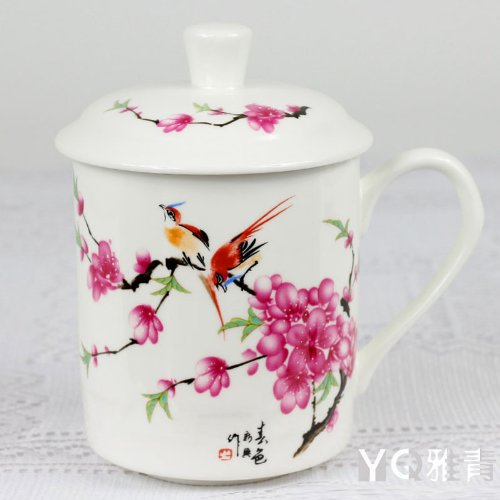 -. Feature : Material:45% bone china---- Capacity:500ml / Size:width:13.5cm,height:14.5cm / Color:white and red / Pattern:hand painted peach blossom and bird / Package quantity:1