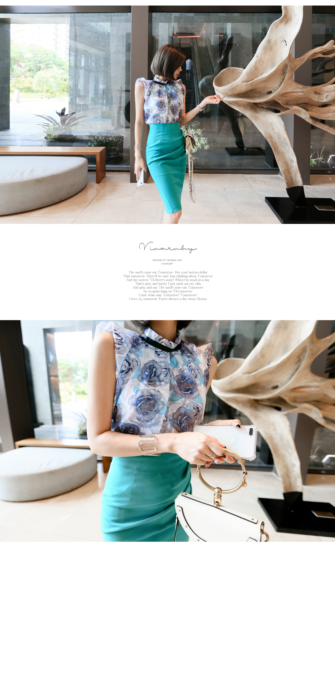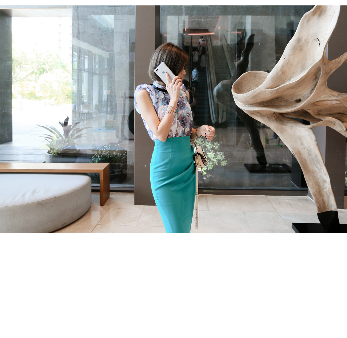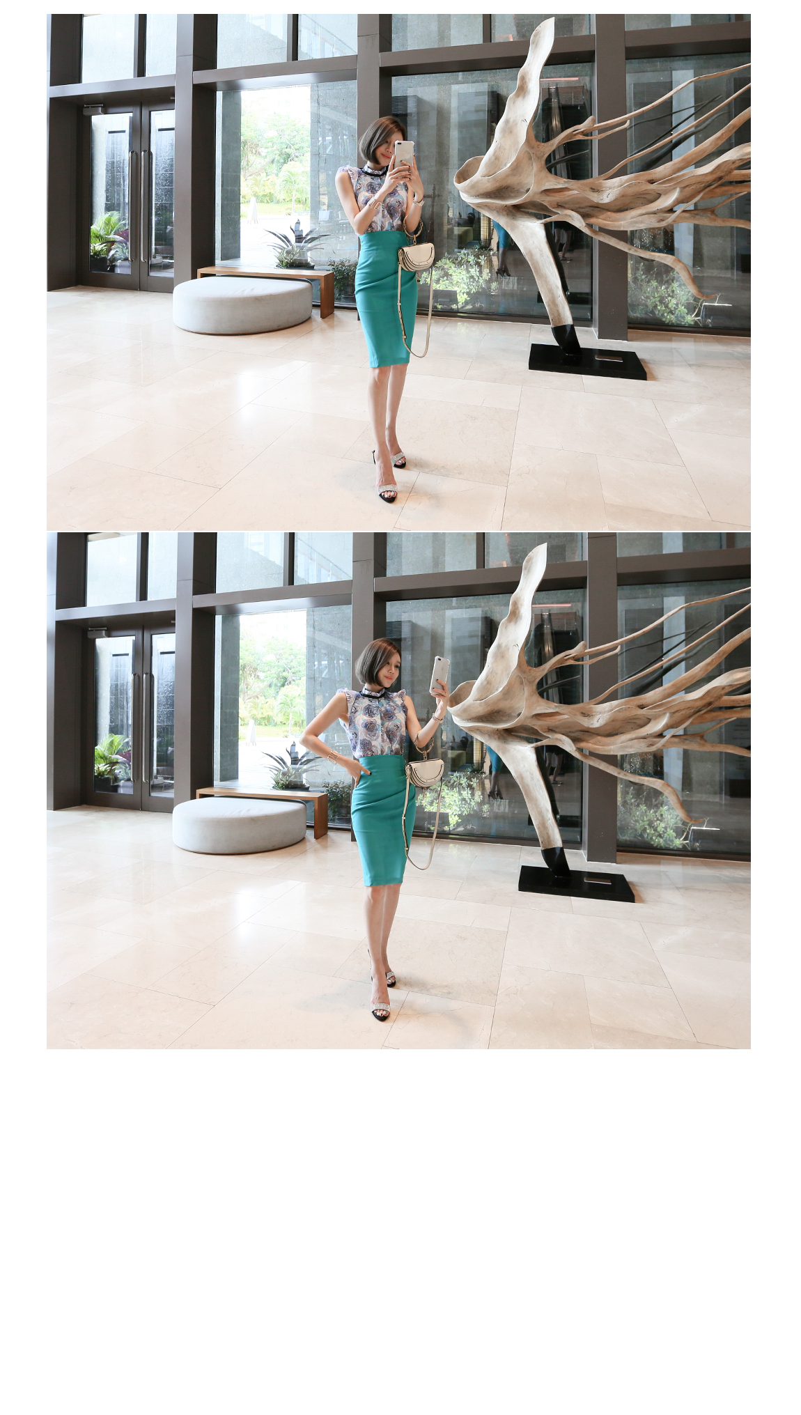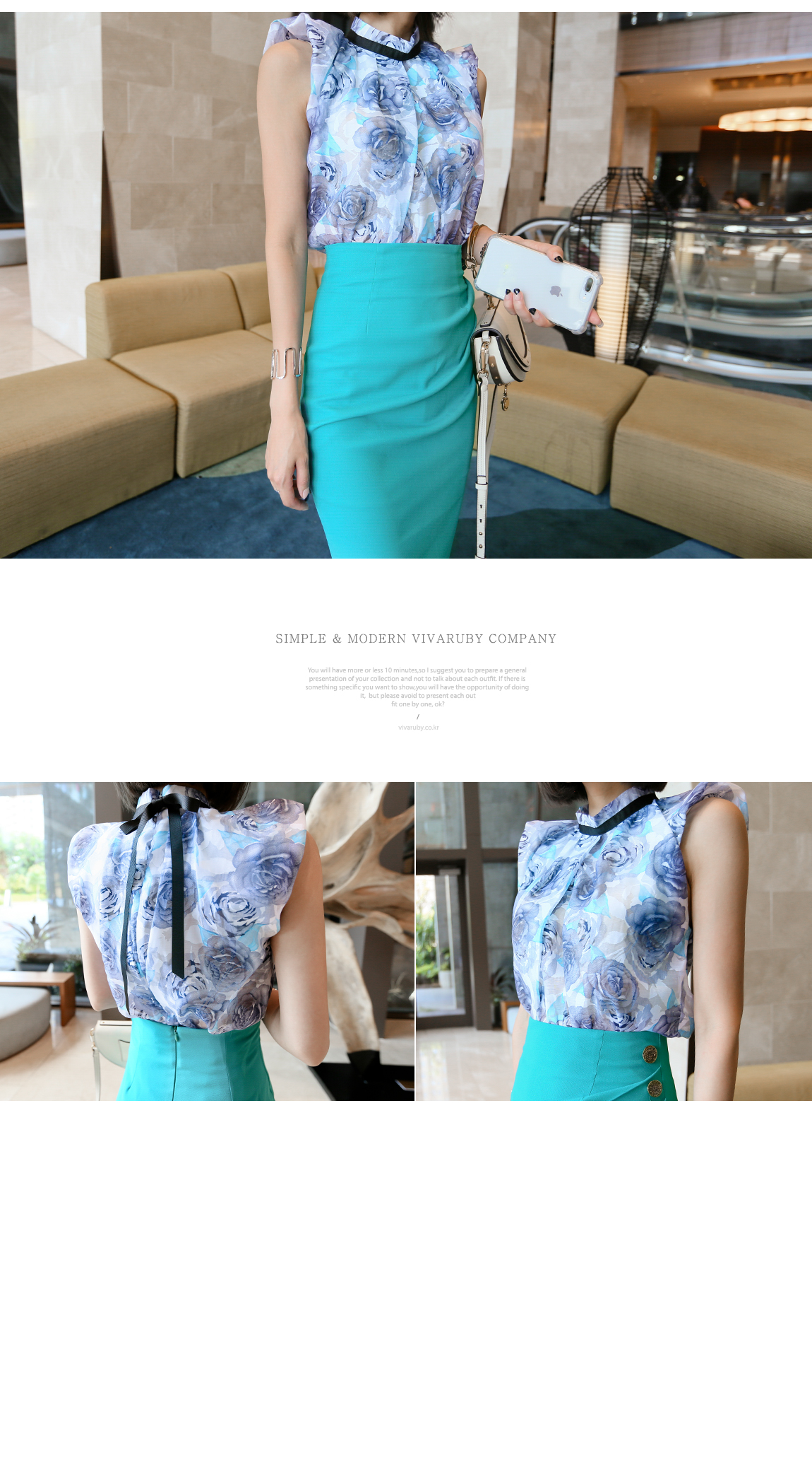 ネックのラインに沿って続くシャーリングはボディーボリューム感を