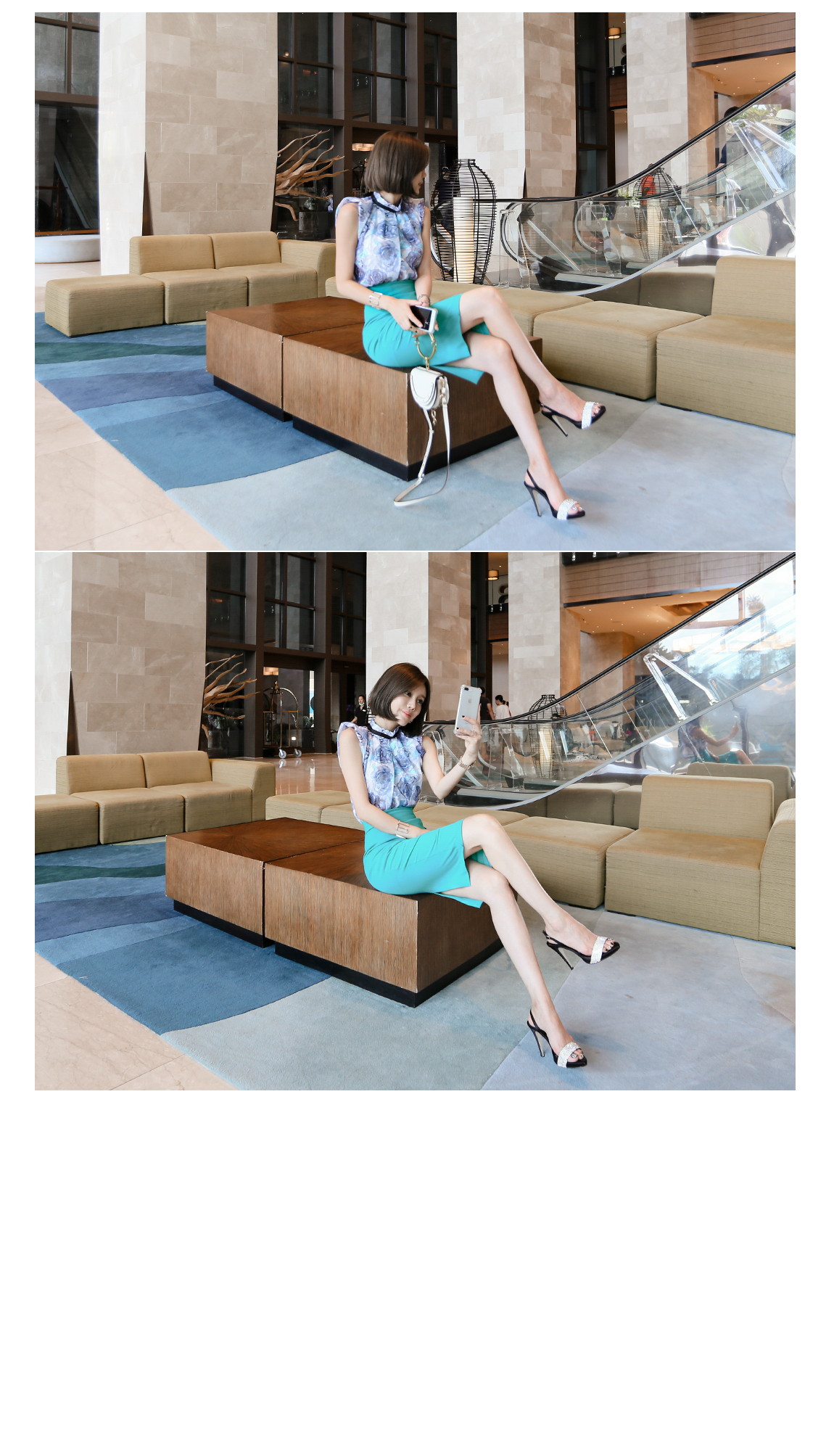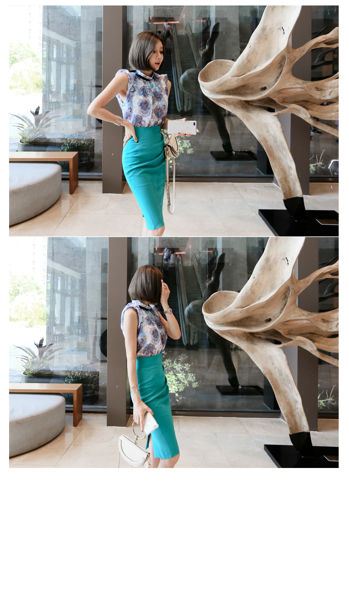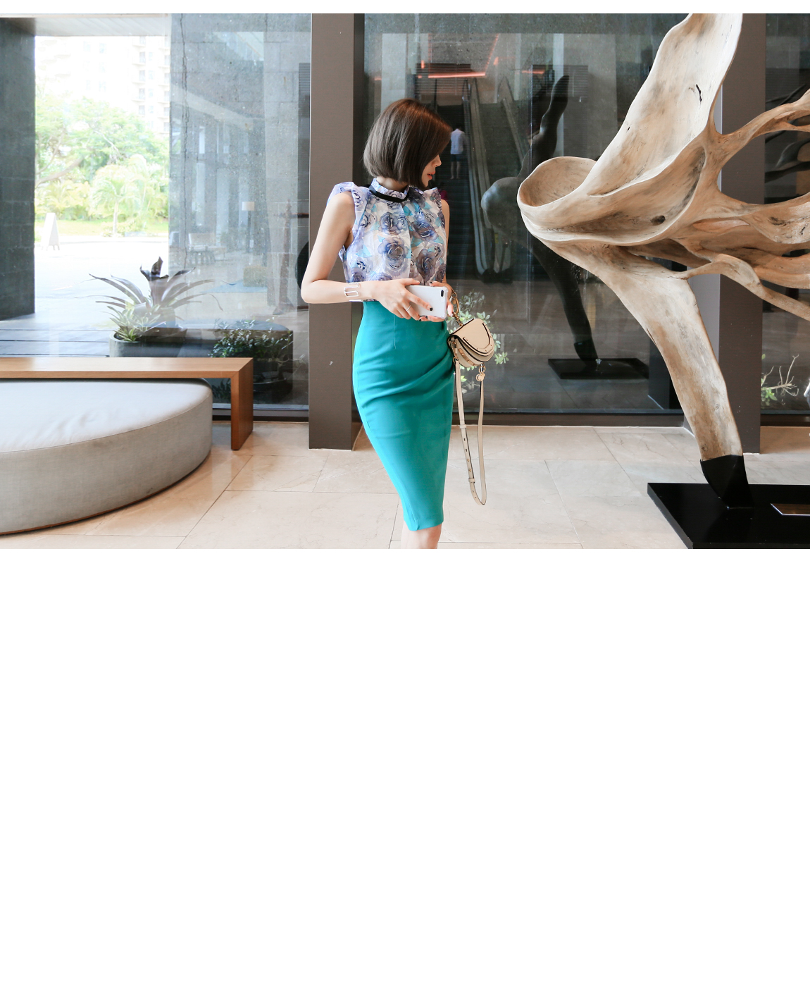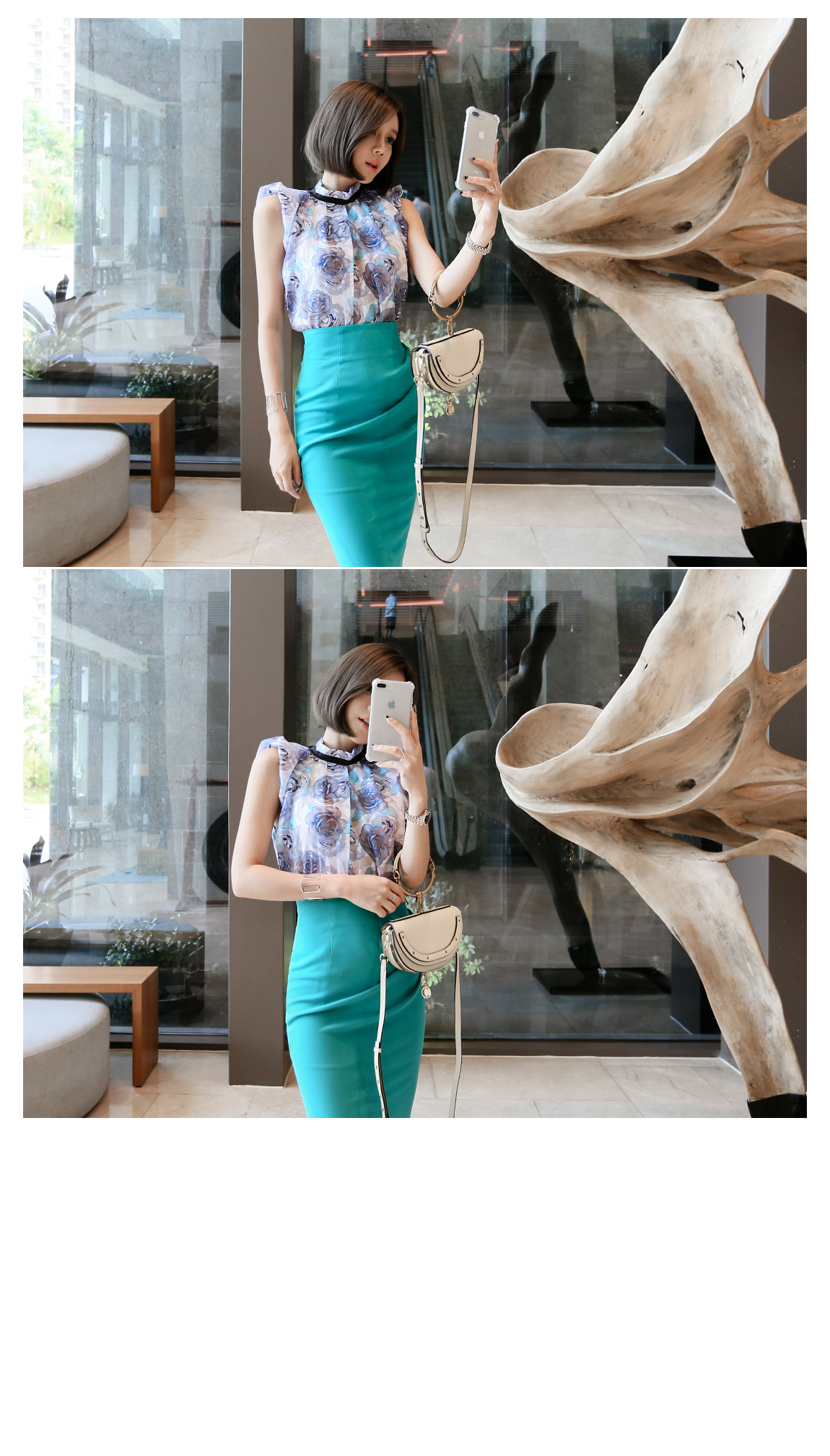 ネックのラインに沿って続くシャーリングはボディーボリューム感を