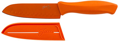 Celebrate color and function with this 5" Tangerine Santoku Knife from Fiesta, perfect for slicing, dicing and mincing. Ergonomically designed soft-touch handles for exceptional comfort and durability. High carbon stainless steel blades with FDA approved, non-stick color coating. As with all fine cutlery, hand-wash is recommended. Wash in warm, soapy water after every use. Dry promptly after washing for best results.