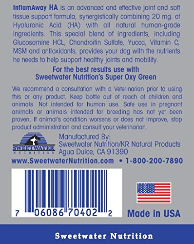 InflamAway HA is a powerful and unique joint support formula created specifically for dogs. Our special blend of human-grade ingredients includes 20 mg. of Hyaluronic Acid (HA) along with Glucosamine, Chondroitin, MSM, Yucca, Boswellia, Curcumin, and antioxidants. This synergistic combination provides your dog with the ingredients he needs for healthy joints and mobility.Feature