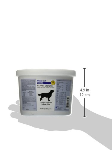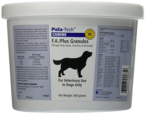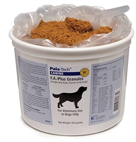 Pala-tech canine F.A. / plus granules is a supplemental source of Omega fatty acids and other essential vitamins and minerals. For supplementation of the diet to aid in the prophylaxis and treatment of fatty acid, multiple Vitamin and mineral deficiencies. Suggested use: the following dosage schedule is recommended for the daily administration of pala-tech canine F.A. / plus granules. Consult with your veterinarian to determine the proper dosage label and schedule for each individual animal prescribed this product. 51 lbs. - 3-4 scoops daily (30-40 grams)a 10 gram scoop is enclosed in the container. Measure out the prescribed daily dose and administer over the dog's food. Product may be mixed with food, if necessary, to facilitate complete consumption. Pala-tech canine F.A. / plus granules is formulated with a proprietary, highly palatable roast beef and liver flavor base to ensure dogs readily consume the supplement. Keep out of reach of children. Ingredients: microencapsulated fatty acids: marine lipid concentrate, flaxseed oil. Vitamins, B1, B2, B6, B12, C, D3, E, Biotin, Choline, Folic acid, inositol, Niacin, Pantothenic acid. Minerals: calcium (calcium phosphate), chloride (sodium chloride), chromium (chromium chloride), Cobalt (Cobalt Sulfate), Copper (Copper Sulfate), fluoride (sodium fluoride), iodine (potassium iodide), iron (ferrous fumarate), magnesium (magnesium oxide), Manganese (Manganese Sulfate), molybdenum (molybdenum trioxide), nickel (nickel chloride), phosphorus (calcium phosphate), potassium (potassium iodide), selenium (selenium powder), silicon (silicon dioxide), sodium (sodium chloride), tin (tin powder), vanadium (vanadium oxide), zinc (zinc oxide). canine F.A. / plus granules by pala-tech - 650 grams.Feature