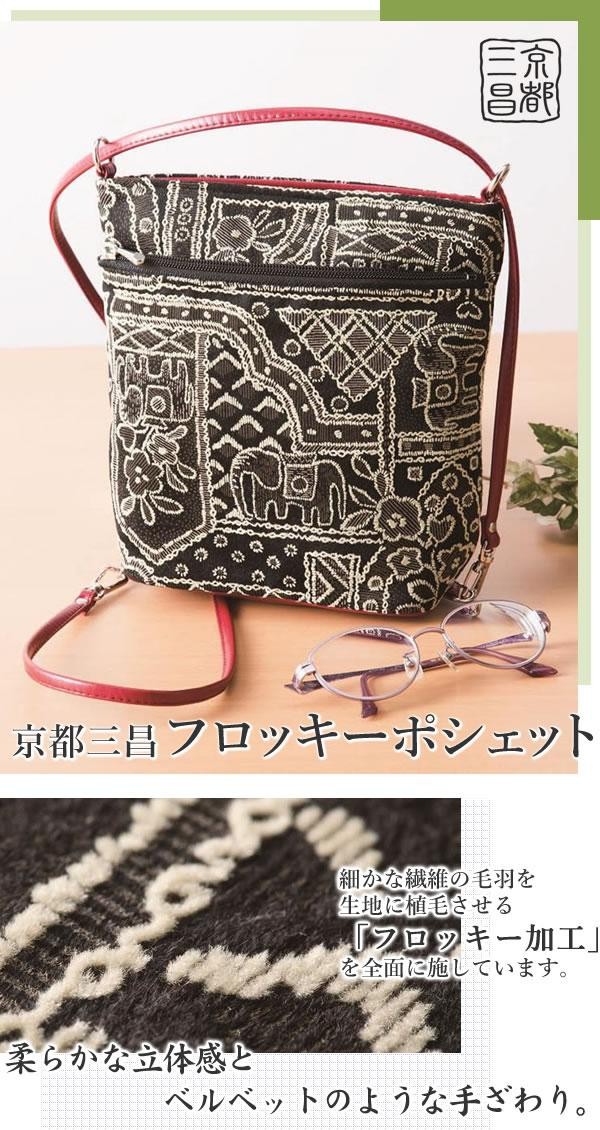| <h1>京都の鞄職人が作る、こだわりのバッグ。ベルベットのような質感のフロッキー生地を全面にあしらい、コーディネートを格上げします。必要最低限のものが入る、ほどよい大きさの軽量ポシェット。旅行にもおすすめです。京都/職人/鞄/バッグ/ポシェット/ショルダー/フロッキー/起毛/ベルベット/ゾウ柄/オリエンタル/モダン/ミセス/シニア/日本製/国産/MADE IN JAPAN</h1> |