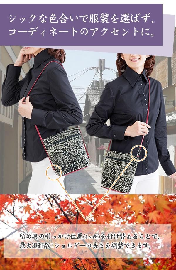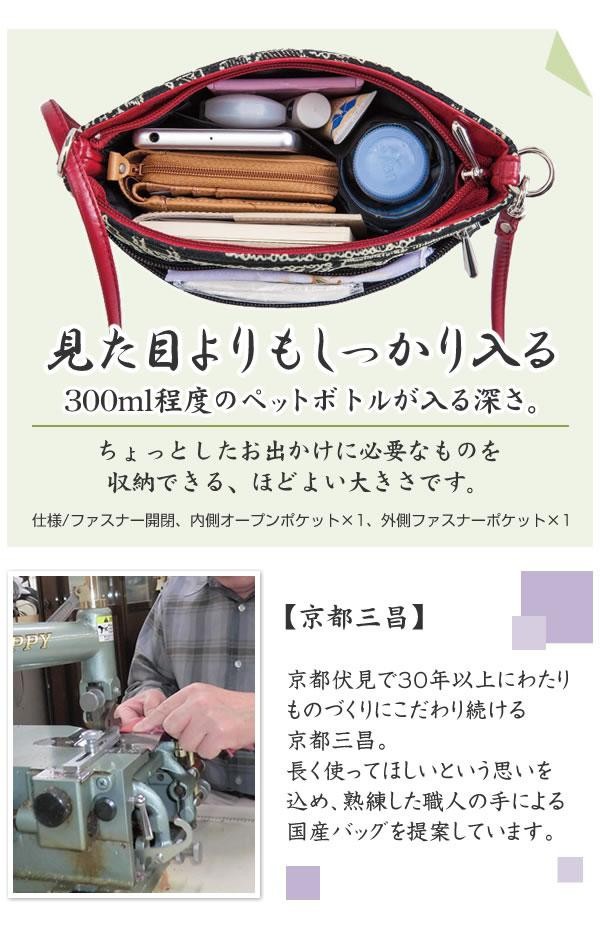 | 京都の鞄職人が作る、こだわりのバッグ。ベルベットのような質感のフロッキー生地を全面にあしらい、コーディネートを格上げします。必要最低限のものが入る、ほどよい大きさの軽量ポシェット。旅行にもおすすめです。 |