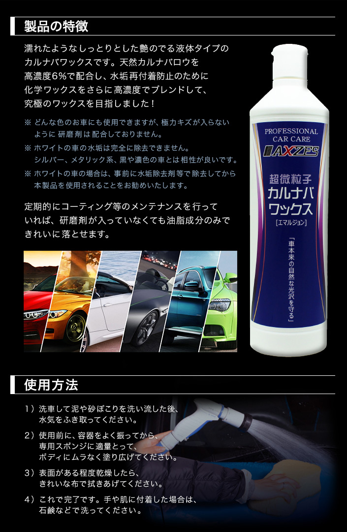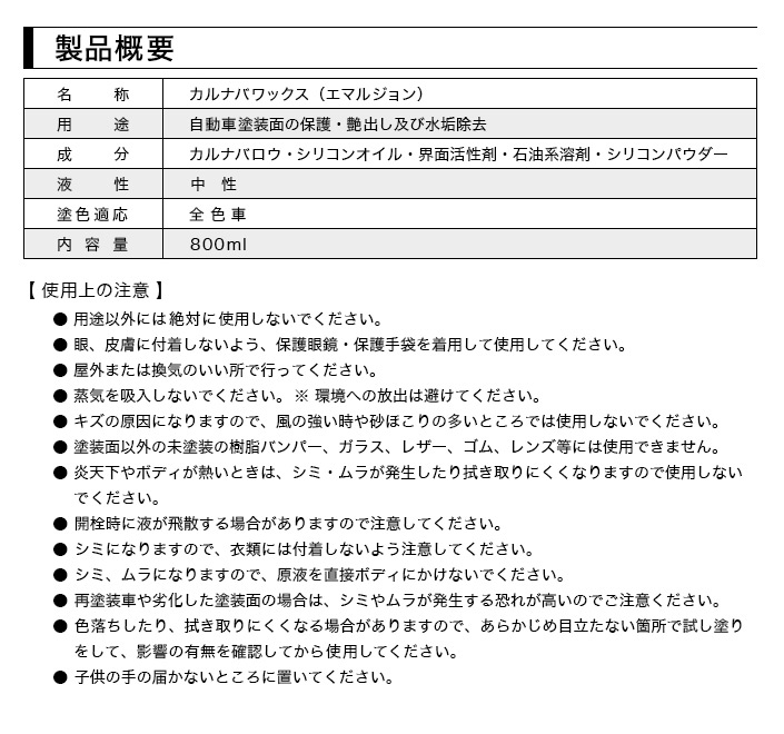 ●天然カルナバロウを高濃度6%で配合し、水垢再付着防止のために化学ワックスをさらに高濃度でブレンドして、究極のワックスを目指しました!