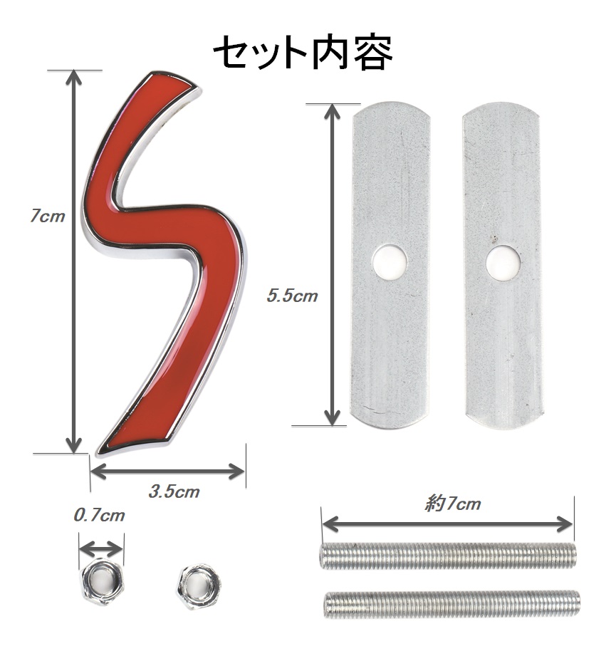 サイズ:エンブレム/長さ7cm、幅3.5cm、ナット/5cm、ステー/5.5cm 適応車種:ミニクーパーS用 ※グリル厚さ45mm以上対応不可
