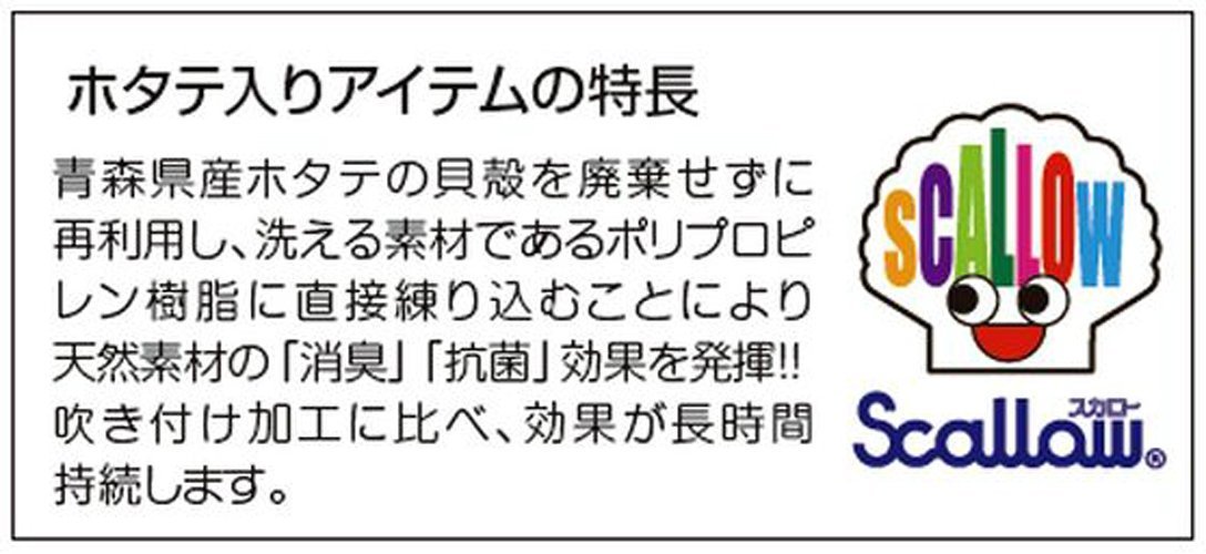 As a feature of entering scallops, reclaim scallops from Aomori Prefecture without discarding them, and directly incorporate them into polypropylene resin, which is a washable material, to demonstrate the "deodorant" and "antibacterial" effect of natural materials!