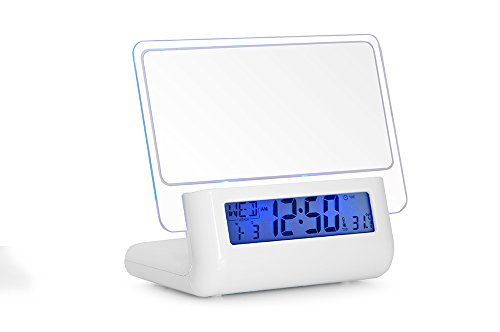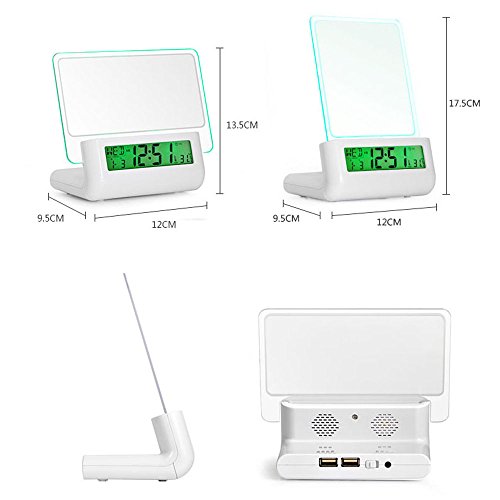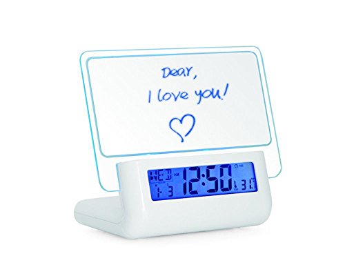 - Feature : Alarm and snooze functions:A set of daily alarm can be set.The time interval of alarm(snooze)can be set after you press broadcast key as long as alarm sounds. Alarm sounds once per ten minutes.When the alarm sounds,you can press any key to stop it / Digital perpetual calendar display:The LCD displays the day of week,month,day,hour,minute,temperature,etc,and converision between the 12-and 24-hour systems is possible / Intelligent voice:Voice broadcast of all items and contents during setup / Message board using highlighter:Message or drawing on the message board can be erased arbitrarily.The message board can be used repeatedly.The transparent board can be taken out easily for cleaning. / Message board backlight:Can be connected to DC power wire.The backlight can be lit up permanently to lighten the message board and can be used as a night lamp.