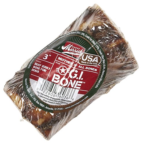 -. Binding : Misc. -. Brand : Merrick -. EAN : 0022808160366 -. Feature : Processed with some of the meat left on creating a flavorful long-lasting treat for your dog / 100% all natural / No artificial colors, flavors or preservatives / Made in the US with ingredients sourced in the US -. Label : Merrick -. Manufacturer : Merrick -. Model : MPC-083 -. MPN : MPC-083 -. NumberOfItems : 1 -. PackageQuantity : 1 -. PartNumber : MPC-083 -. ProductGroup : Pet Products -. ProductTypeName : PET_SUPPLIES -. Publisher : Merrick -. Size : 2-3" -. Studio : Merrick -. Title : Merrick G.I. Bone - 3" -. UPC : 022808160366