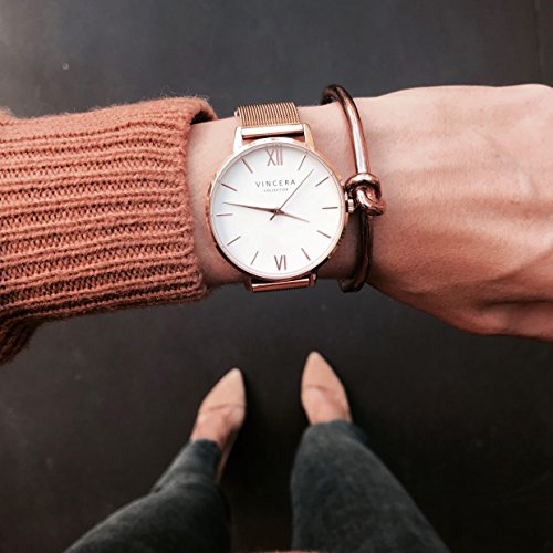 We created Vincero because we were tired of the cookie cutter designs and mass produced minimalist watches that have flooded the market. We believe a watch does so much more than tell time - it tells the world what you're all about. So we set out to re-invent the industry with a mission based on a few, core values: Quality is the most important thing; Always create gear that is bold and uncompromising; Consistently deliver products at a fair price. The Eros watch is scratch and water resistant and also comes with a mesh band. This timepiece has a rose gold casing, white dial and rose gold mesh band.Feature