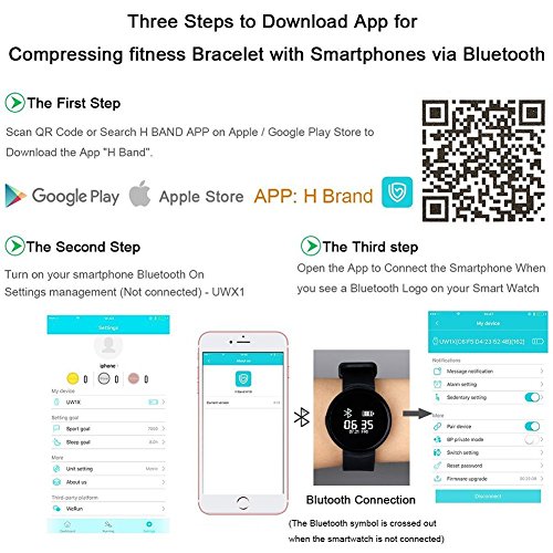 Bluetooth Connection Procedures: 1. Ensure smart band is fully charged before first use. (We recommend 500mAh current USB enabled device such as PC tablets or laptops to charge it.) 2. Download "H Band" App from Apple Store/Google Play or scan QR code on User Manual. 3. Turn on Bluetooth of your phone. 4. Press the function button to turn on the watch. 5. Open the app, enter "Dashboard" - "Click to connect device", pull down to search and connect "UW1X".