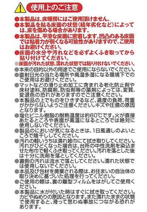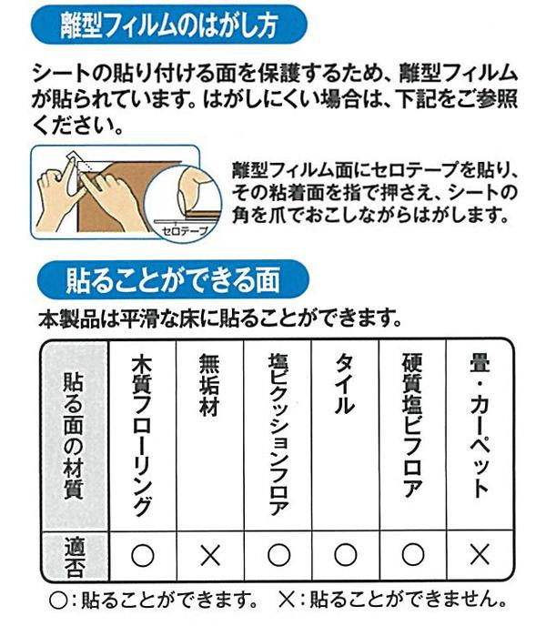 | 素材・材質 | 表面:塩化ビニル樹脂100% 裏面:アクリル樹脂100% 離型フィルム:ポリエチレン100% |