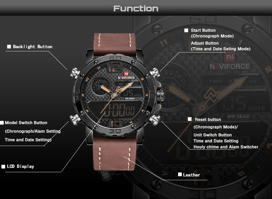 Feature:Water Resistant,Stop Watch,Auto Date,Complete Calendar,Back Light,Shock Resistant,Chronograph