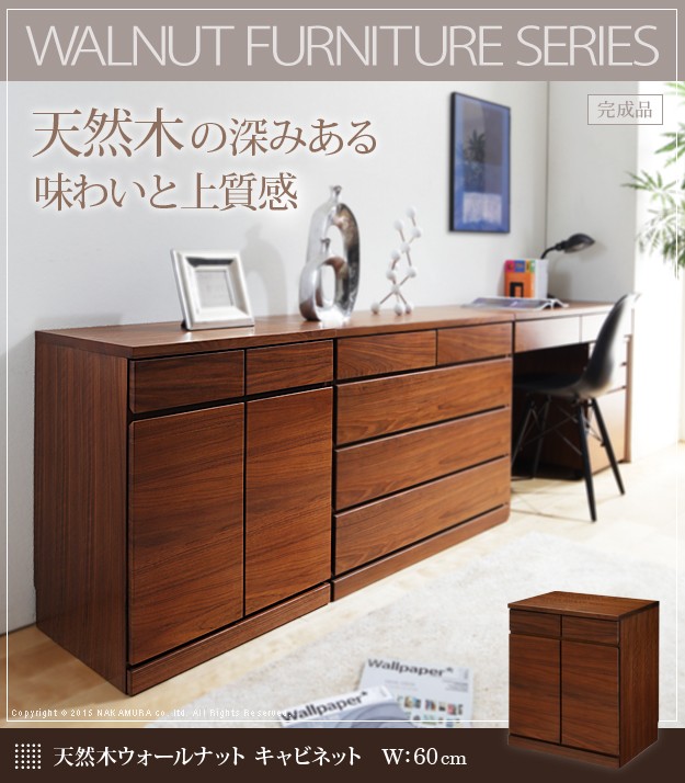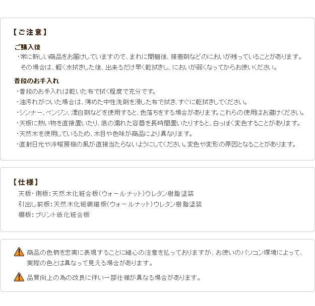 材質:天板・側板-天然木化粧合板(ウォールナット)、引出し前板-天然木化粧繊維板(ウォールナット)、棚板-プリント紙化粧合板、ウレタン樹脂塗装