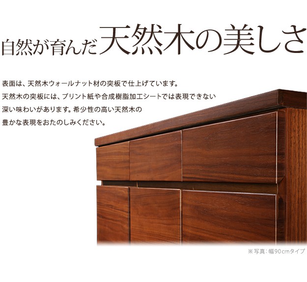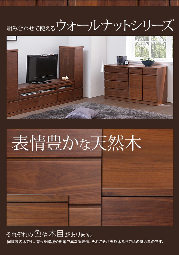 商品について:こだわりの天然木突板を使用したウォールナットキャビネット。引出しはレール付きで開閉がスムーズ☆扉内は可動棚板付きで6cm間隔5段階の調節可能です。
