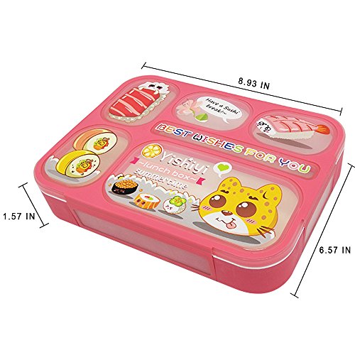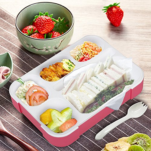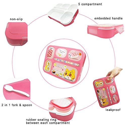 Bento Box for Kids, FIOLOM 5 Compartment Leakproof Meal Prep Container Portion Control Lunch Container with Spoon Dishwasher Safe Reusable Bento Boxes for Kids, Boys, Girls, School (Pink)