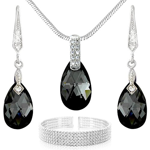 -. Binding : Jewelry -. Brand : Crystal Elegance UK -. Department : womens -. Feature : Designer piece - Beautiful and elegant tear drop earrings and pendant set made from Swarovski element crystals / Earrings measure 3.5cm drop down and 1cm (crystal width) x 1.5cm (length) approx. / Silver tone snake chain measures 38cm-40cm. Pendant crystal measures 1.5cm x 2cm approx / Comes with an elegant silver tone 5 row crystal studded bracelet. ( 1.4cm x 17cm approx) / Comes in a black and silver glitter effect gift box with black velvet sponge lining. -. Label : Crystal Elegance UK -. Manufacturer : Crystal Elegance UK -. Model : oiuy675 -. MPN : oiuy675 -. PartNumber : oiuy675 -. ProductGroup : Jewelry -. ProductTypeName : FASHIONNECKLACEBRACELETANKLET -. Publisher : Crystal Elegance UK -. Studio : Crystal Elegance UK -. Title : Black Crystal Silver Tone Drops Jewelry Set - Necklace Bracelet Earrings - Swarovski Elements Crystals