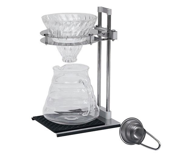 | ハンドドリップに必要なスタンド・ドリッパー・サーバー・スプーン・ペーパーのセットです。シンプル&スタイリッシュなデザインで、どんな食卓にもなじみます。HARIOのドリップスケールと組み合わせて使用可能。サーバーの大きさに合わせてドリッパーの高さ調節が可能です。 |
