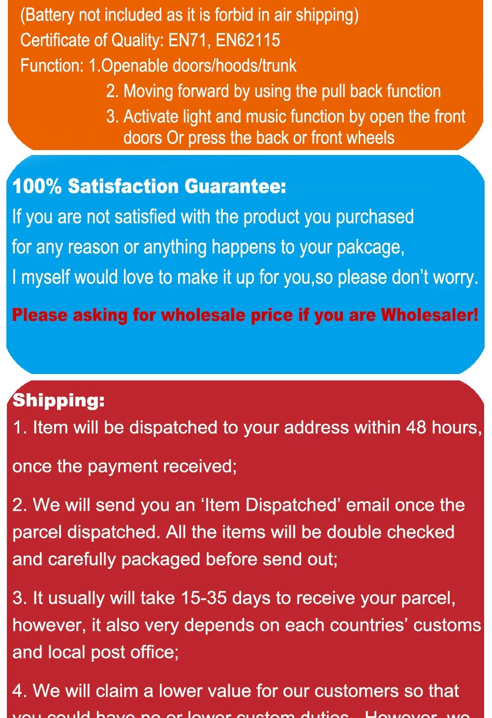 Functions :Light+Music+Pull Back Wheels+Openable doors