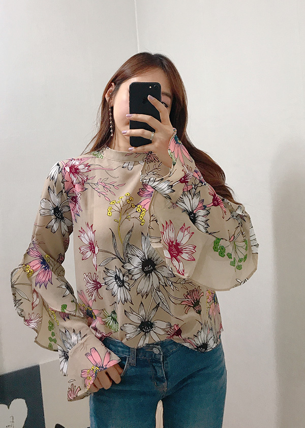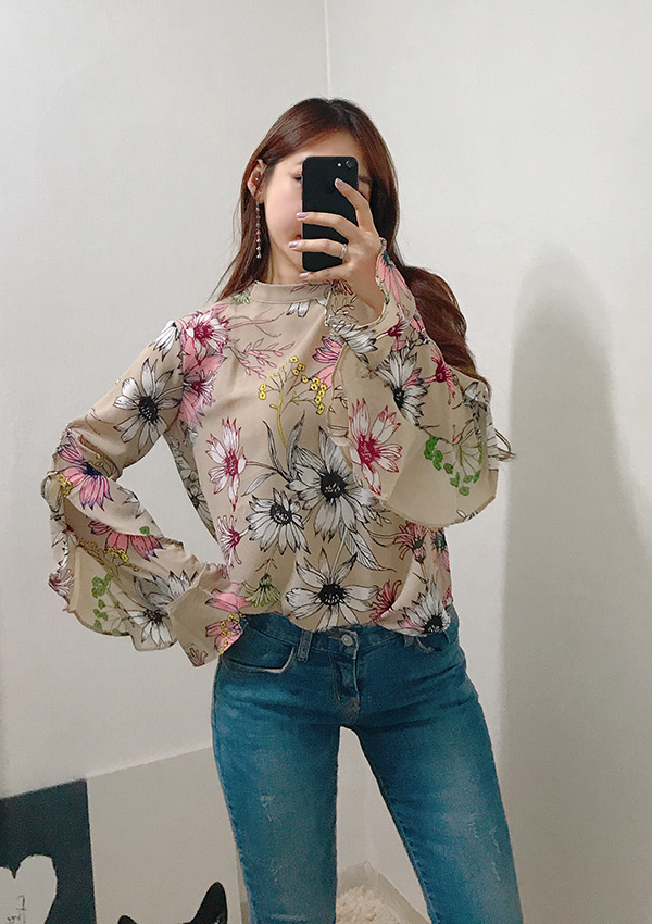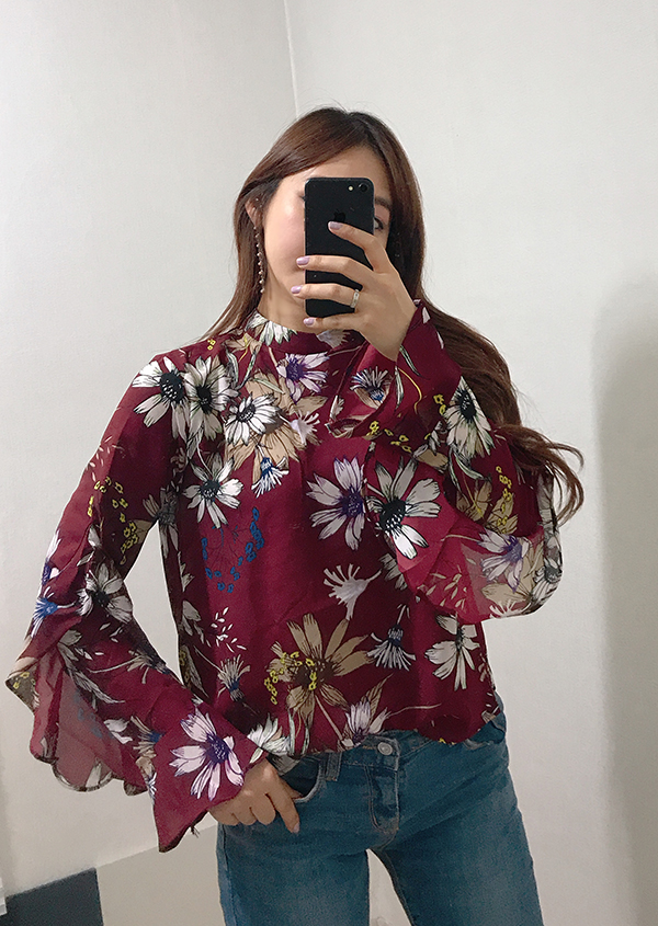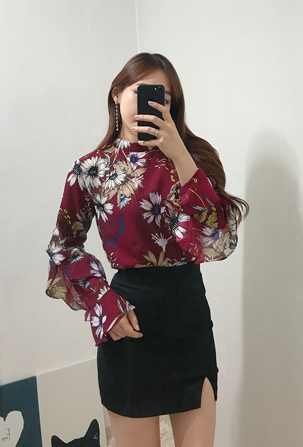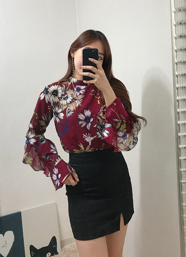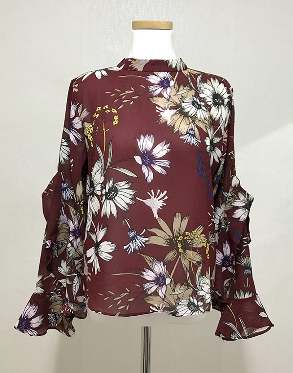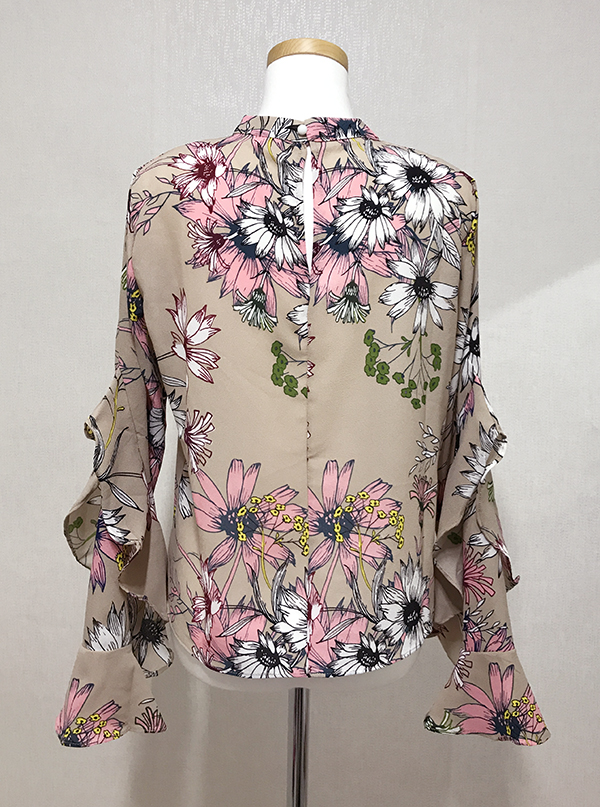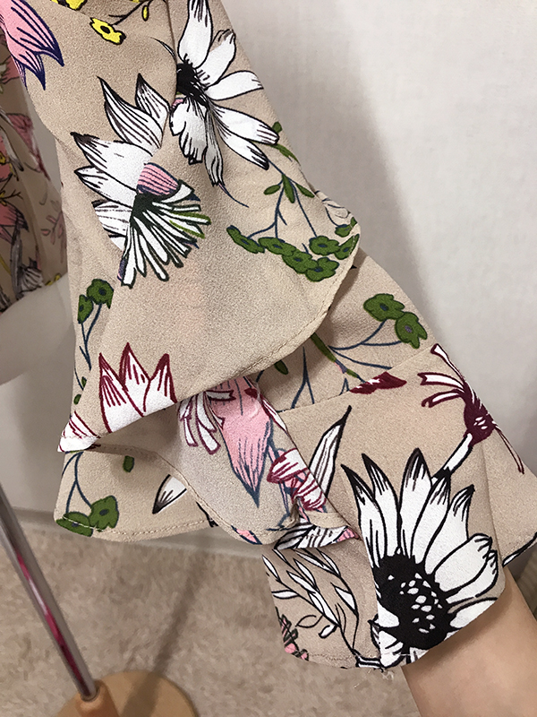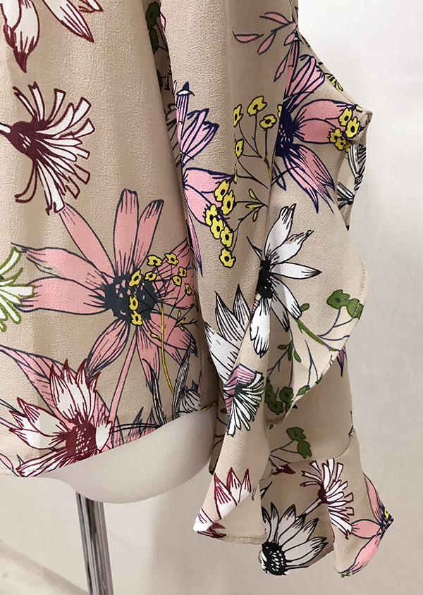 Fall Specials Ruffle Sleeves Chiffon Flower Blouse Beige Navy Wine Sophisticated Office Look