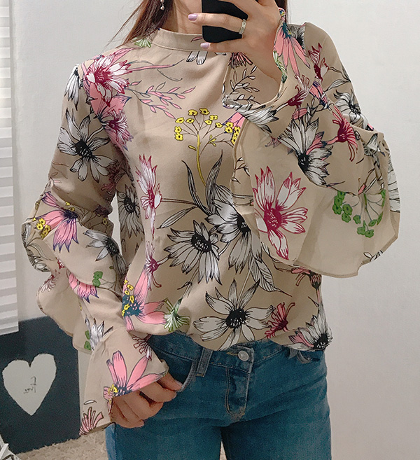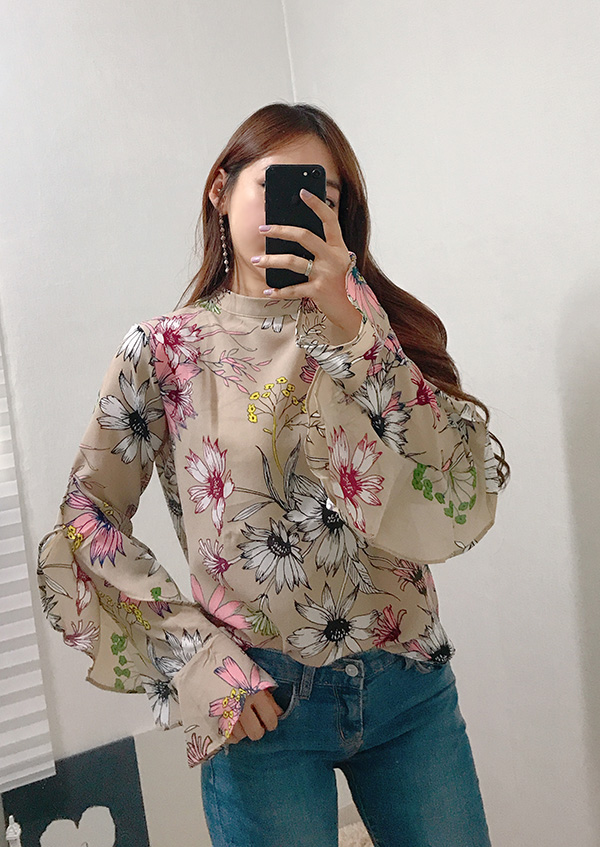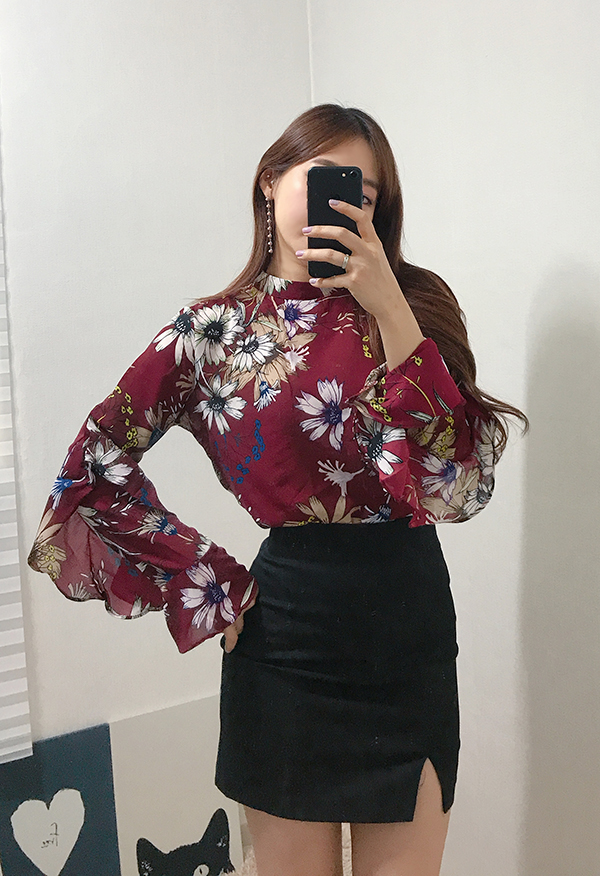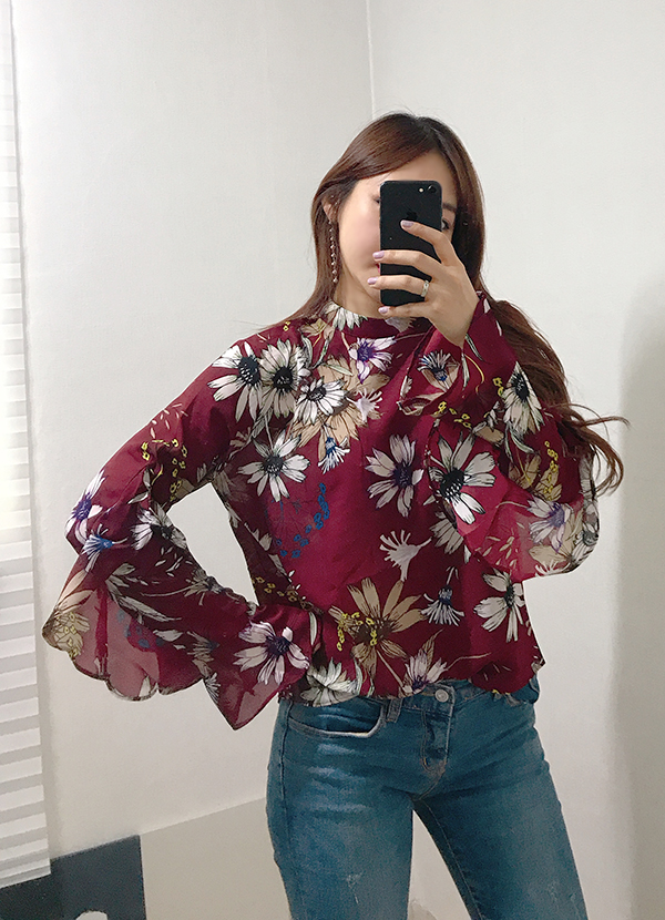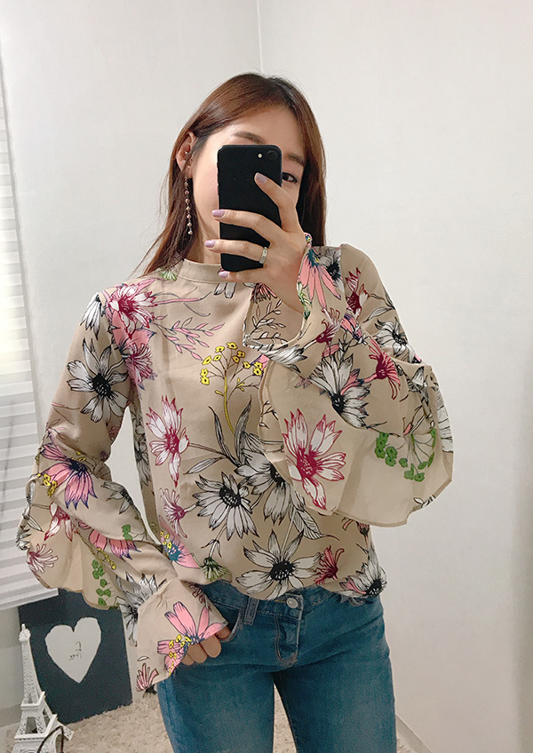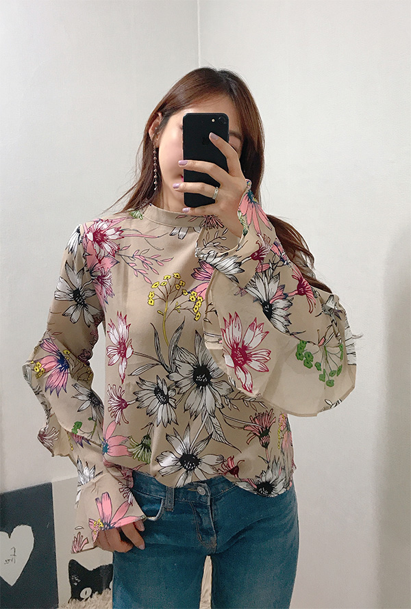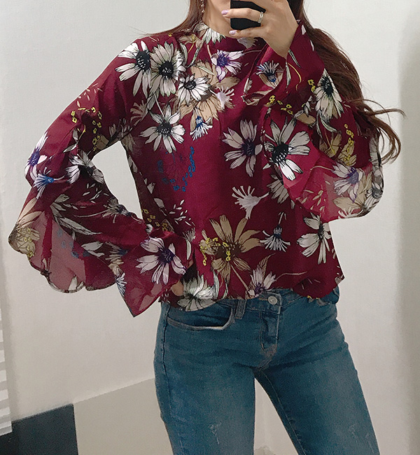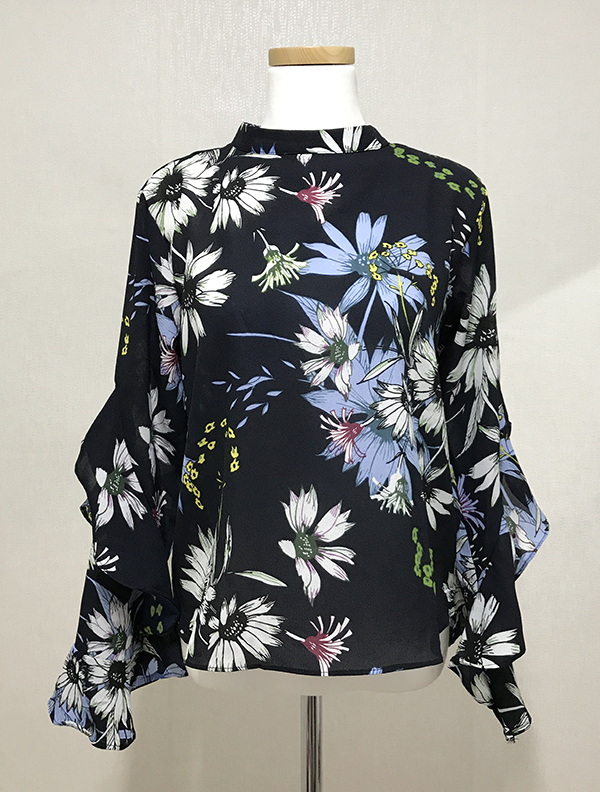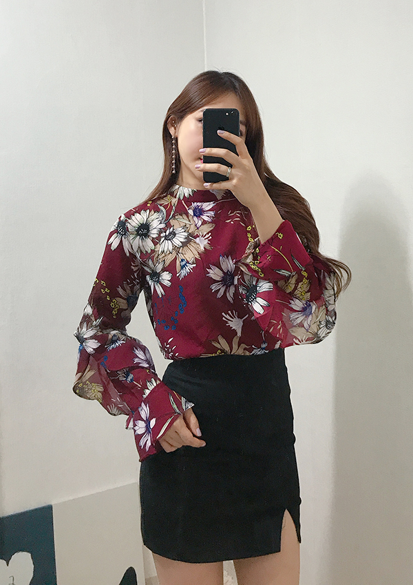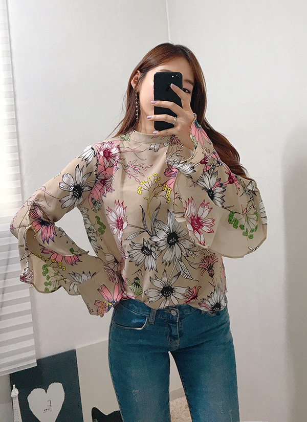 Fall Specials Ruffle Sleeves Chiffon Flower Blouse Beige Navy Wine Sophisticated Office Look