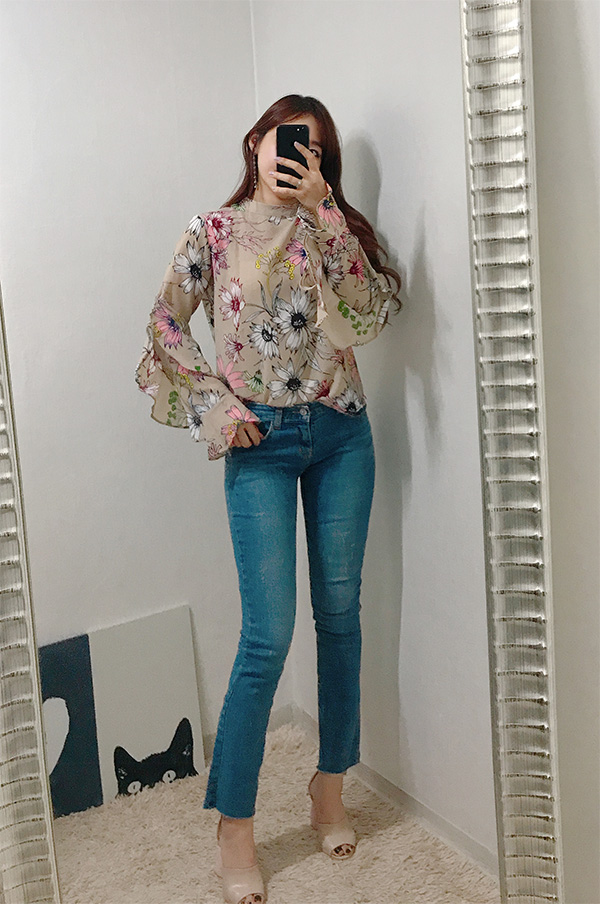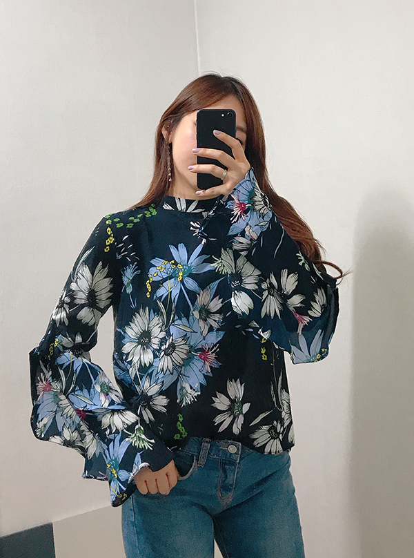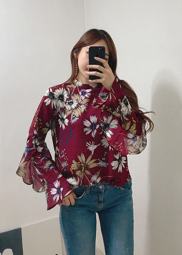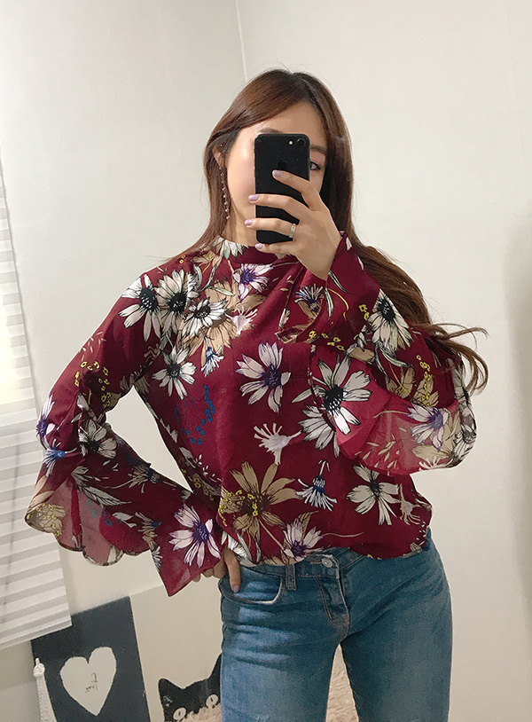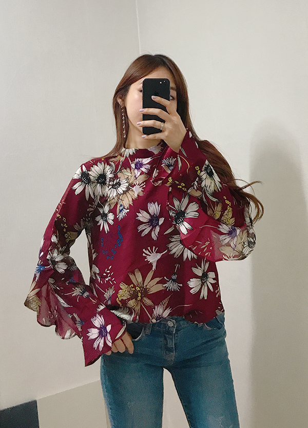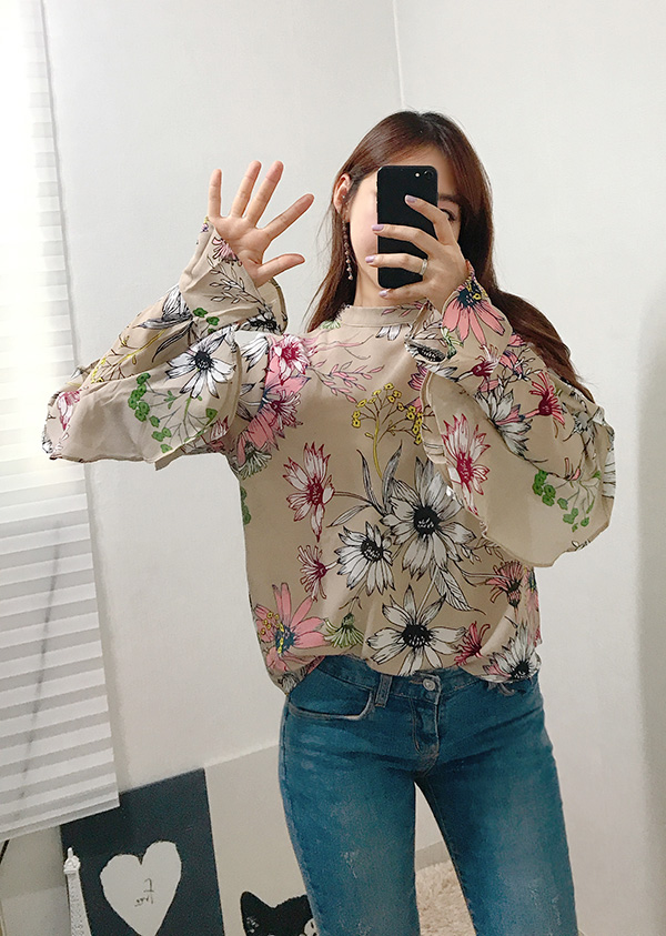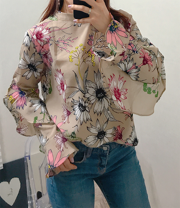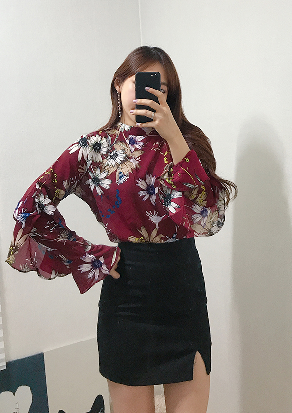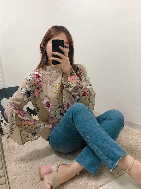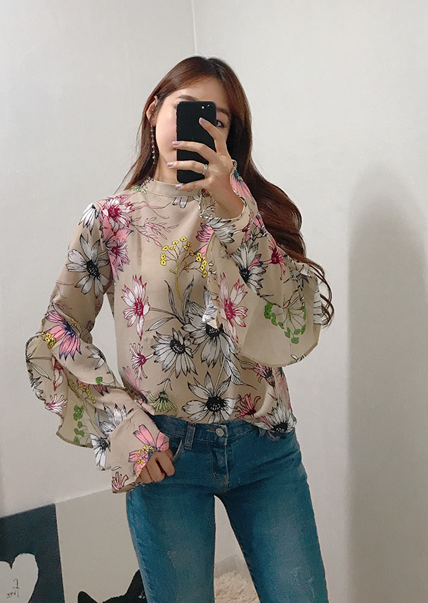 Fall Specials Ruffle Sleeves Chiffon Flower Blouse Beige Navy Wine Sophisticated Office Look
