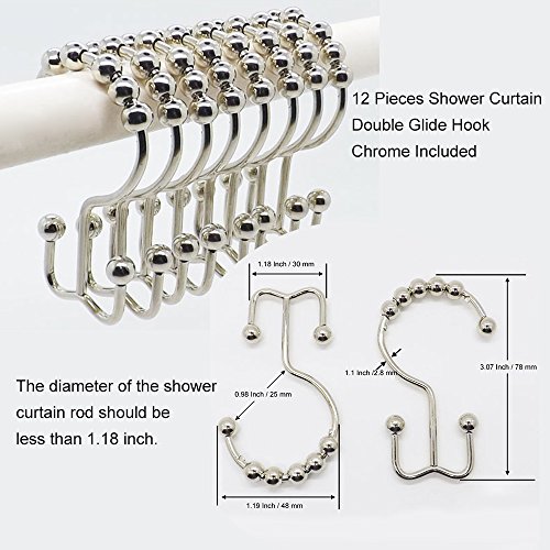 DOUBLE SLIDE HOOKS: 12 Pieces Double Slide Chrome Hooks are included, thoroughly considering the needs of inside shower curtain liner peva and outside decoration one. Chrome plated and stainless steel material makes being durable over 10 years in wet shower. The shower curtain rob should be less than 1.18 inch.