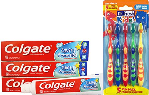 -. Feature : Colgate Toothpaste Kids Cavity Protection is Sugar Free and Gluten Free, and in the Bubble Gum Fruit Flavor Your Child will Love. / Colgate Toothpaste Kids Flouride Toothpaste is Clinically Proven to Fight Cavities and is Enamel Safe / Colgate Toothpaste Kids Cavity Protection is Anticavity Which Means Less Cavities for Your Child / 5 Dr. Fresh Kids' Toothbrushes come in Multicolors, for Boys or Girls, Have Extra Soft Bristles that Effectively Clean While Gentle on Childrens' Teeth. They have Rubber Stands that will keep Toothbrush Clean on Your Counter / Included are 5 Toothbrushes and 3 Toothpastes, so You Won't Have to Keep Replacing Your Child's Toothbrush or Toothpaste