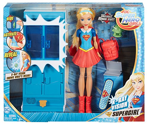 -. Feature : Look inside this locker accessory with Supergirl action doll and a cool interactive light-up locker feature to play out her x-ray vision! / With a Kryptomite figure included, young fans can recreate a key scene from the new DC Super Hero Girls story Intergalactic Games / First, turn on the locker by pressing the button at the bottom of the locker. Then, place the green Kryptomite figure inside one of the two top lockers of the four-locker accessory. Bring Supergirl action doll near and press the button in her back to see the top two lockers light up and reveal the secrets hidden inside -- so cool! / Supergirl action doll is ready for adventure wearing her signature outfit with her S-shield, a white collar, red skirt and red and blue wrist cuffs / Removable accessories for the 12-inch doll include red boots, a blue headband and her iconic red cape
