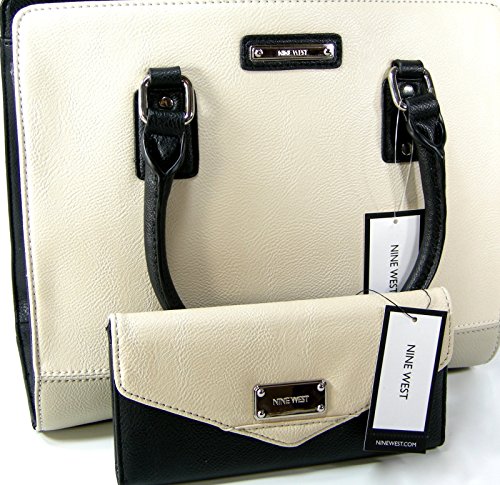 -. Brand : Nine West -. Color : Black, Beige -. Department : womens -. EAN : 0740348135704 -. PackageQuantity : 2 -. ProductGroup : Shoes -. ProductTypeName : HANDBAG -. Size : Large -. Title : New Nine West Logo Purse Hand Bag Tote & Matching Checkbook Wallet 2 Piece Set -. UPC : 740348135704 2 Piece Set = 1 Satchel Crossbody Purse & 1 Checkbook Wallet Description: The exterior is black beige (cream) with the Nine West name plate in silver. The interior is fully lined and divided into 3 separate compartments with a zipper pocket in the middle. It includes an interior zipper pocket, a cell phone pocket and an additional slip pocket. It measures 10 inches by approximately 11 3/4 inches. The drop on the double straps measure approximately 6 inches. Completing this bag is a removable shoulder strap. Tag Information: Style No.: 60362005-030 Name: You and Me Color: AL/RU/B Wallet: Measures 7 1/2 inches by approximately 4 inches. Interior: 13 credit card slots, a clear window for your ID, a pocket for the checkbook, pen holder and larger pockets for cash. Back zipper pocket for change. Matching checkbook cover with a duplicate/carbon check flap. Picture holder that holds 12 pictures. Tag Information: Style No.: 60377479-5VM Name: Color Mix Slgs Color: Blk/TDO