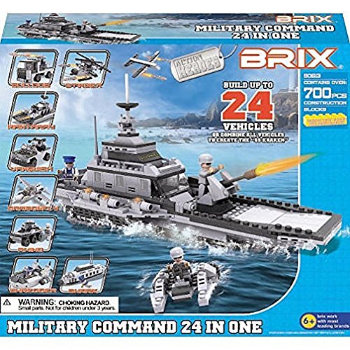-. Binding : Toy -. Brand : Brix Military Command -. EAN : 0885777906133 -. Feature : Super Set comes with enough pieces to build 24 Different vehicles or 1 SS Kraken / Contains over 700 construction blocks / Brix are compatible with most leading brands / Recommended for children ages 6+ -. IsAdultProduct : 0 -. Label : CRA-Z-ART -. Manufacturer : CRA-Z-ART -. MPN : 99013 -. PackageQuantity : 1 -. PartNumber : 99013 -. ProductGroup : Toy -. ProductTypeName : TOYS_AND_GAMES -. Publisher : CRA-Z-ART -. Studio : CRA-Z-ART -. Title : Brix Military Command 24-in-1 Building Blocks Super Set -. UPC : 885777906133