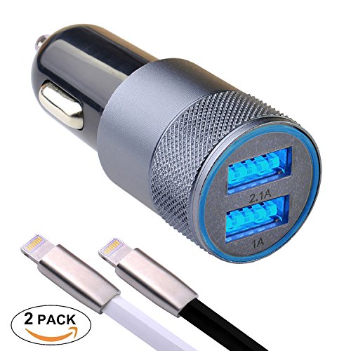 -. Feature : ⭐️ COMPACT and STYLISH dual layout of two usb car charger ports provides FAST CHARGIN of 2 of your devices at the same time by using our durable lightning cables not only for iPhone X/8/8 Plus/7/7 Plus/6/6 Plus/6S/5/5S/5C/SE/iPad/iPod but also for other Apple devices that use a lightning cord / ⭐️ Nice LIGHTING USB ports 12 v 3.1 a portable car charger will ensure hassle-free access to the quick charge car charger IN THE DARK. An elegant glowing blue RING gives elegance to your taste for details / ⭐️ ALUMINIUM METAL main part and corrugated tip usb car charger will provide you with a PLEASANT FEELING while operating and long-term use. This portable adapter charging ANDROID phones, but with Your type-c cables. iPhone car charger kit CE, ROHS, FCC certified / ⭐️ Car rapid charger comes with a SET OF 2 durable lightning cords for iphone phone FOR FREE (black/white). You can forget about the entanglement problem. They are Tangle-Free (MADE of durable RUBBERIZED material, can withstand up to 9.000 bendings). The connectors of the car charger cables are FRAMED with ZINC ALLOY. Sturdy 3 ft lightning cable is long enough for a phone charge in a vehicle / ⭐️ Cell phone car charger is compatible with Apple charger cord and are suitable for charging almost ALL MODELS of Apple phone devices. You get an 8 month guarantee on cellphone car charger and apple lightning cable