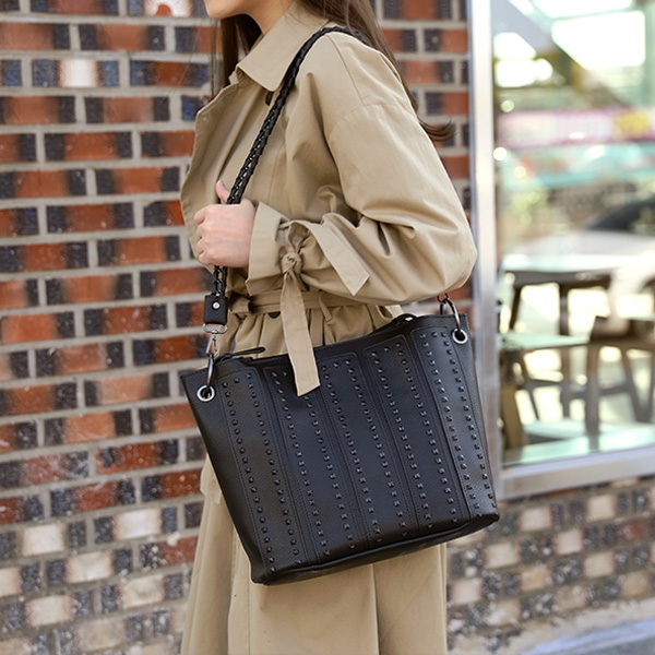 |  매끄러운 촉감의 합피 소재에 가방 전면에 더해진 스터드 장식으로 고급스러운 퀄리티를 느낄 수 있는 찡 가방이에요 가방 컬러와 유사한 컬러의 스터드 장식이 더해져서 더욱 고급스러운 느낌을 up! 넉넉한 크기감으로 여러 가지 소지품들을 수납할 수 있어 편하게 사용하실 수 있어요 파우치가 함께 구성되어 있어 분리 수납이나 별도로 사용할 수 있어 실용적이구요 심플한 데일리룩에 포인트 주기도 좋고 다양한 스타일에 부담스럽지 않게 잘 어울린답니다 상세페이지 확인 후 굿초이스 해주세요! *모델 착용 컬러 - BLACK(블랙) /DARK BEIGE(다크베이지)         | COLOR | 블랙 / 그레이 / 다크베이지 / 카키 / 레드 | | 제품 색상은 모니터에 따라 실제 색상과 차이가 있을 수 있습니다. | | | | FABRIC | 합성피혁 | | | | PRODUCTION | 제조국 / 중국 | | 품질보증기준 / 소비자분쟁 해결기준에 따름 | | A/S 책임자 및 고객센터 / 감성가방 | | | | SIZE INFO | 사이즈는 측정 방법에 따라 1~2cm의 차이가 있을 수 있습니다. | | 스트랩 길이는 연결 고리를 제외한 길이이며, 최대 길이입니다. | | (단위:cm, g) | | 가로 길이 | 세로 길이 | 너비 | 손잡이 높이 | 스트랩 길이 | 무게 | | 40 | 28 | 15 | 19 | 38(조절x) | 1030 |  |