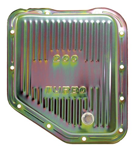 Product Description Chevy/GM finned zinc steel transmission pan fits Turbo 200 transmissions. Features a stamped 200 Turbo logo and comes with drain plug. Depth: 2-5/8". 0