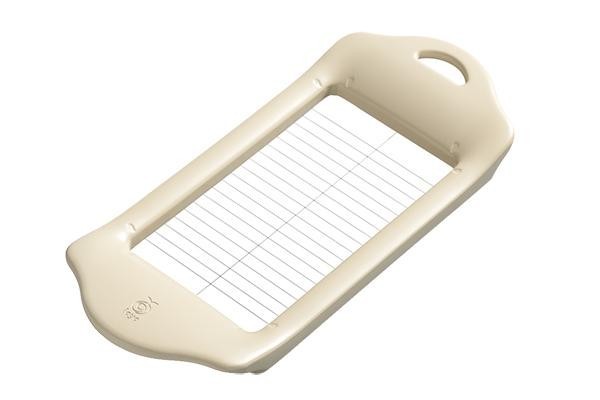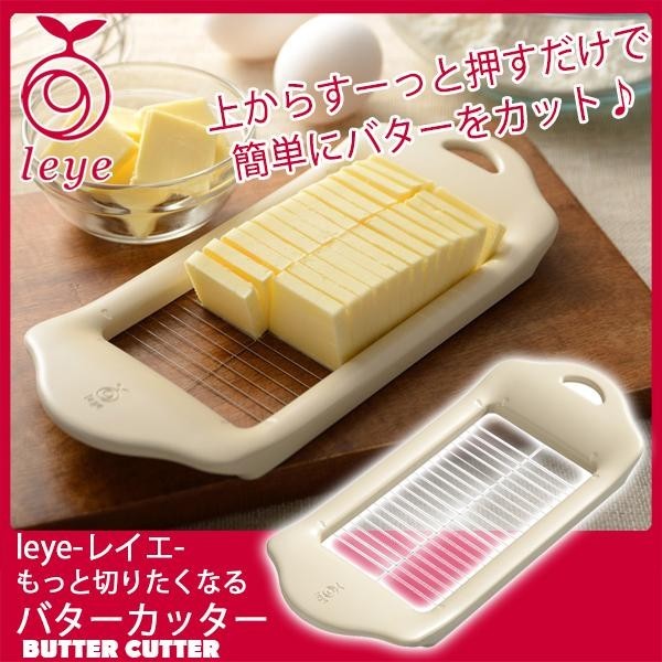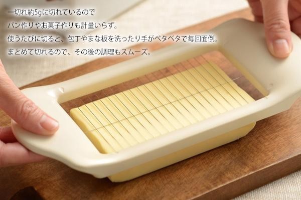 | 上からすーっと押すだけで簡単にバターをカットできます。200gのバターなら一切れ約5gになるので、お菓子作りやパン作りの分量の目安になります。450gのバターもしっかり切れる丈夫な作りです。 |