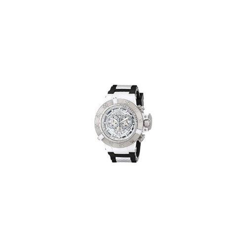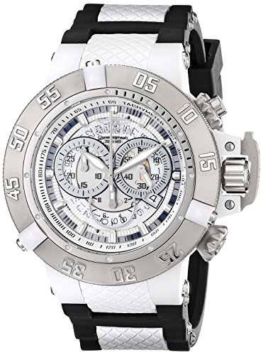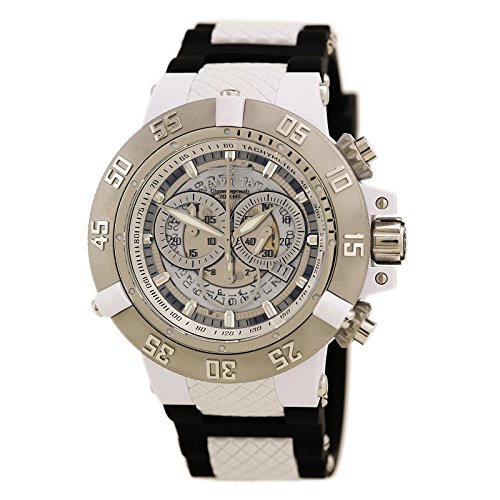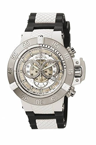Studio : Invicta Publisher : Invicta Binding : Watch Product Description Product DescriptionA sporty flurry of functionality, the Invicta Men's 0924 Anatomic Subaqua Collection Chronograph Watch is a rugged chronograph that will take you there and back again, whether your destination lies at the finish line or in the depths of the ocean. This chunky watch kicks off with a round 50mm white plastic case with a stainless steel case back, unidirectional stainless steel bezel with three white markers and finally a textured screw-down crown with a protective clasp and two pushers. These elements surround a textured and transparent white dial, which is protected by a flame-fusion crystal and features luminous silver-toned index hour markers and luminous silver-toned hands powered by precise Swiss quartz movement. The dial also features a tachymeter scale on the inner bezel, three chronograph sub-dials offering 60-second, 30-minute and 1/10th-of-a-second displays, and a date display window at the 4 'o clock position. A black rubber band with textured white accents straps this watch to the wrist, while a reliable buckle clasp ensures its secure placement. A fashionable bit of functionality with a remarkably clean color palette, this Invicta timepiece looks amazing on the wrist.Product DescriptionStainless steel case with a black plastic strap. Unidirectional stainless steel bezel. White dial with luminous silver-tone hands and index hour markers. Minute markers. Tachymeter around the outer rim. Date scale around and inner ring. Dial Type: Analog. Luminiscent hands and markers. Date display at the 4 o'clock position. Chronograph - three sub-dials displaying: 1/10 second, 60 second and 30 minute. Quartz movement. Scratch resistant flame fusion crystal. Screw down crown. Solid case back. Case diameter: 50 mm. Case thickness: 18 mm. Band width: 29 mm. Tang clasp. Water resistant at 200 meters / 660 feet. Functions: chronograph, date, hour, minute, second. Sport watch style. Invicta Subaqua Chronograph Mens Watch 0924.See all Product Description 0