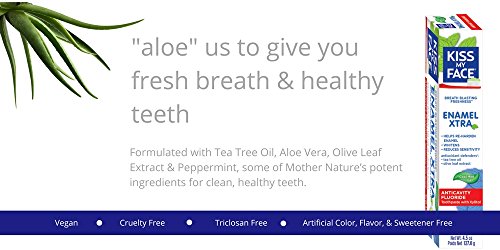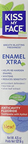 ReleaseDate : 2016-03-19 Studio : Kiss My Face Corp Publisher : Kiss My Face Corp Binding : Health and Beauty Product Description The Kiss My Face Enamel Ant cavity Gel Toothpaste formula is rich in calcium and minerals to help rebuild enamel and reduce sensitivity. Natural ingredients and Antioxidant Defenders are Xtra helpful in keeping your mouth healthy. Plus you'll enjoy the popular breath-blasting taste. No triclosan, sls, artificial flavors or sweeteners. Kiss My Face also goes the Xtra mile to take care of the planet, and has always been cruelty-free. One kiss is all it takes for a beautiful smile! 0