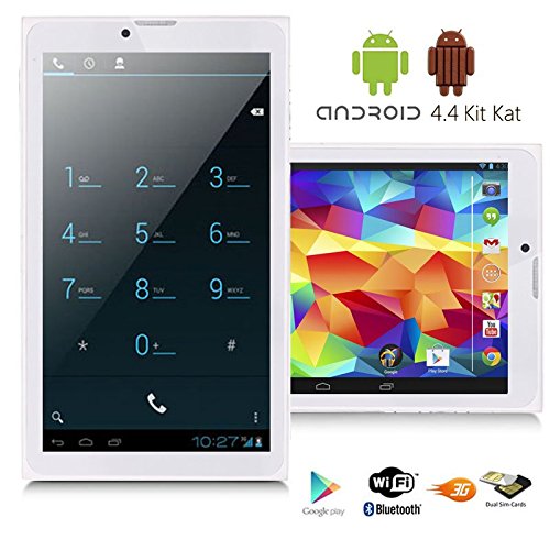 -. Feature : 7.0 inches Android 4.4 Kitkat 3G Phablet 2-in-1 Tablet PC + GSM Wireless SmartPhone (Call as mobile phone) with Google Play Store and HD Capacitive Multi-Touch Screen / GSM Mobile Cell Phone - Support 3G GSM QuadBand: GSM 850/900/1800/1900MHz WCDMA 850/2100MHz|Make and receive calls directly from the tablet itself with the built-in MIC and speaker / Powered by MTK MT8312 DualCore Processor 1.2GHz CPU, 8GB Internal Memory, Latest Android 4.4 Kitkat Operating System, Integrated 802.11 b/g/n, Bluetooth, Dual-Camera, Dual Sim and more. / WiFi 802.11 b/g/n Support - Connect to internet for A full Internet experience | Bluetooth enabled - connect to any bluetooth headset handsfree / Support Google Play Store and preinstalled - access to millions of free and paid-for applications available to download straight to your phablet.