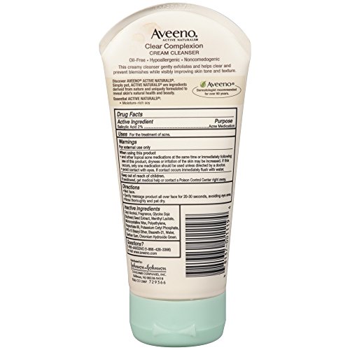 ReleaseDate : 2014-05-12 Studio : Aveeno Publisher : Aveeno Binding : Misc. Product Description Aveeno Clear Complexion Cream Cleanser helps clear and prevent breakouts while visibly improving skin's tone and texture. For dull, uneven skin, this cleanser is formulated with gently exfoliating micro-beads. Salicylic acid fights and prevents blemishes, while Active Naturals Total Soy Complex hydrates your skin. Aveeno Clear Complexion Cream Cleanser is oil-free, hypoallergenic, and non-comedogenic, and is also non-irritating and non-drying to skin. 0
