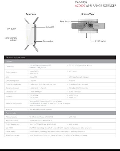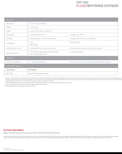 The D-Link DAP-1860 AC2600 Wi-Fi Range Extender delivers the ultimate performance for the most demanding tasks, like 4K video streaming, gaming, and multiple device usage. With a sleek design and wireless speeds of up to 2,532 Mbps, the DAP-1860 will let you enjoy a fast wireless connection. Featuring a 4 x 4 antenna configuration as well as SmartConnect and SmartBeam technology, the DAP-1860 offers better data rates, fewer dead spots, more coverage, and increased reliability. It also includes an Access Point mode that is ideal for homes that are pre-wired for Ethernet or for extended coverage. You'll extend Wi-Fi coverage throughout your home and even into your backyard, creating a stronger signal in all of those hard-to-reach areas.