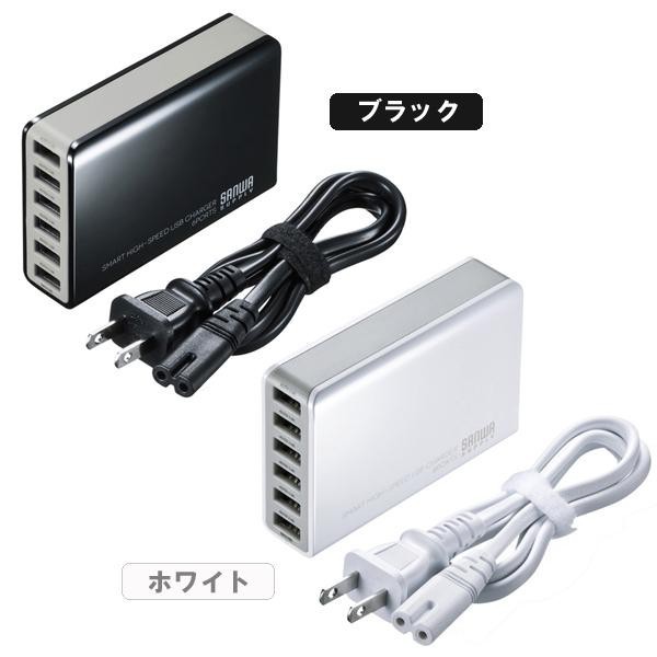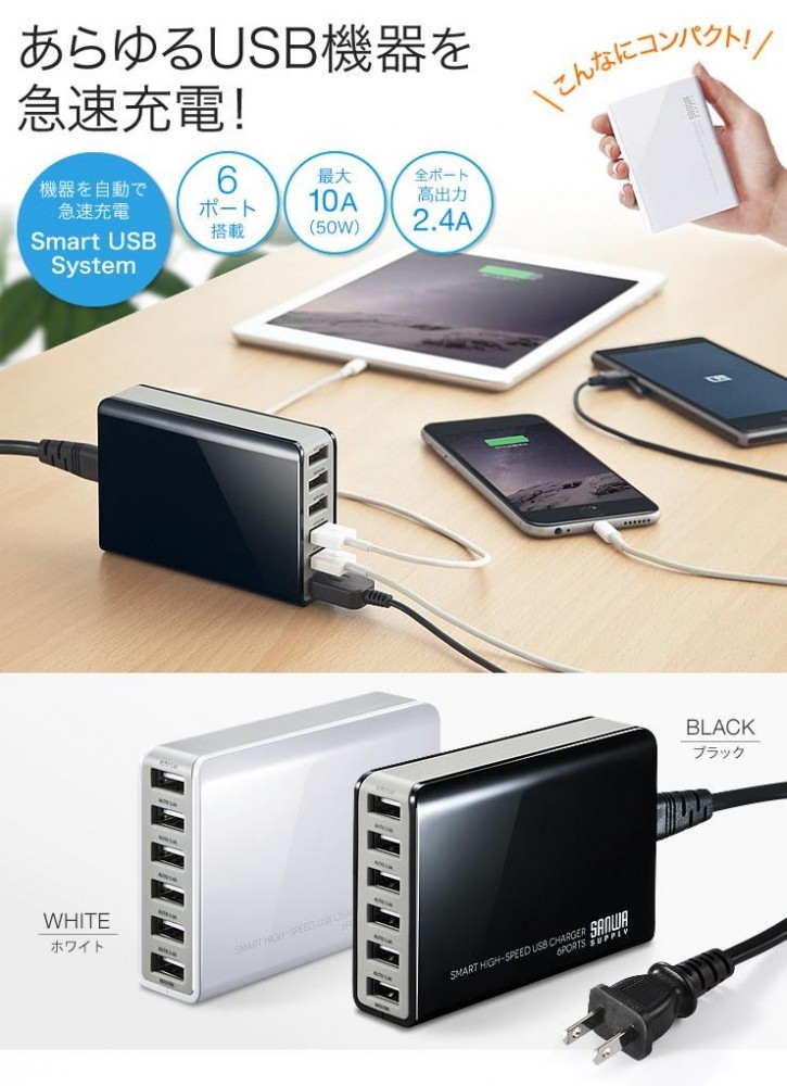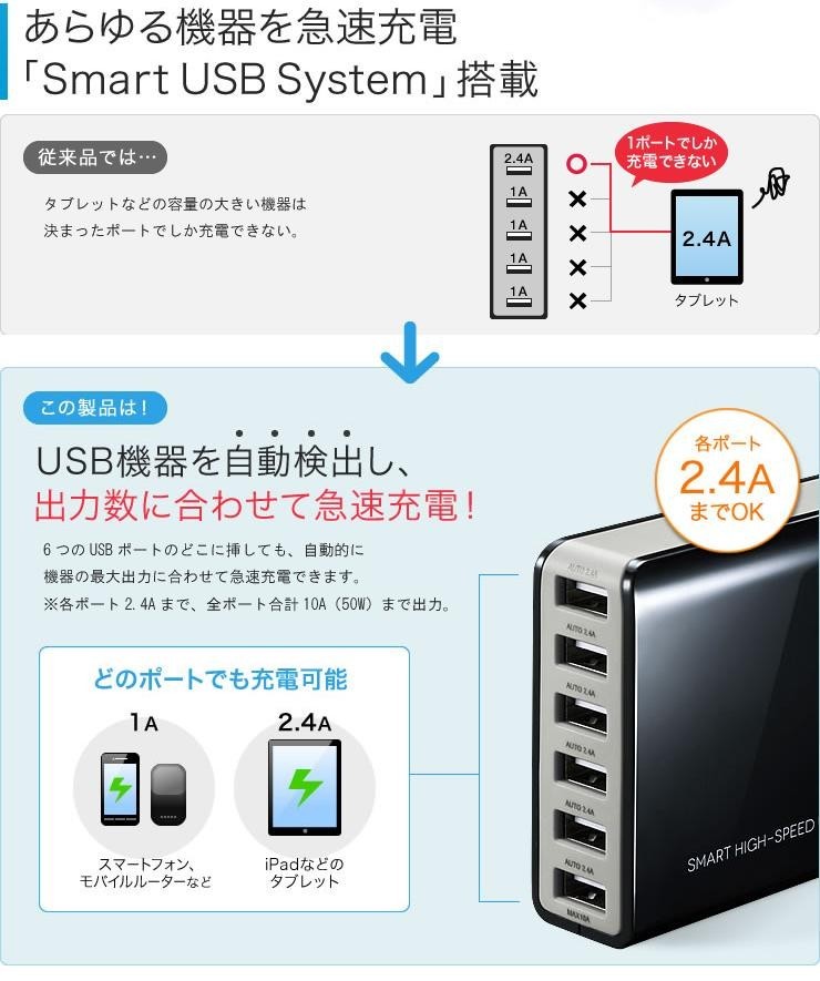 USBポート出力自動判別機能「Smart USB System」搭載で、6台までのUSB充電対応機器を急速充電可能。最大出力10A(50W)まで対応しています。 |