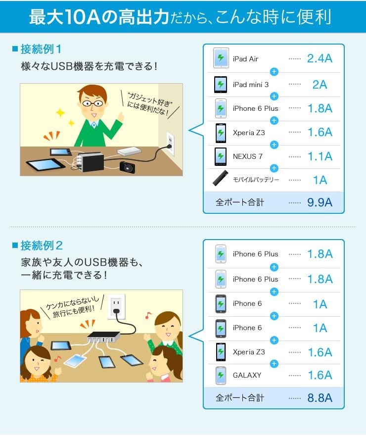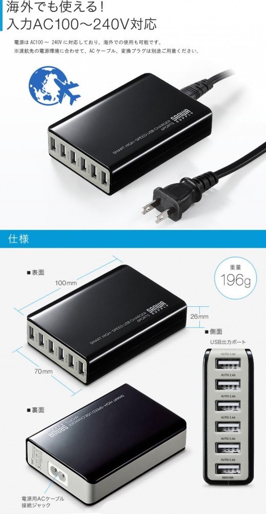 | 仕様 | 【定格入力】 AC100~240V 50/60Hz 1.5A 【定格出力】 DC5V・10A(最大) 【電源出力形状】 USB Aタイプ(メス)×6ポート(2.4A×6ポート)※合計出力最大10A(50W)まで使用可能です。 【対応機種】 Apple iPad・iPhone・iPod、Android、サムスン製タブレット、その他タブレット、モバイルWi-Fi、携帯型ゲーム機などUSB充電対応機器 ※SIMフリースマートフォン covia FLEAZF4・CP-F03aに付属のケーブルでは充電できません。別途充電用ケーブルをご用意ください。 |