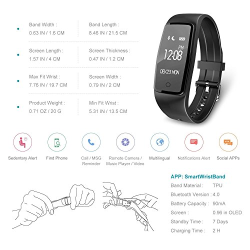2.MOVEMENT MONITOR (STEPS, DISTANCE, CALORIES,Can monitor a variety of movement patterns): Recording all day activity and calculating the walking distance as well as calories energy consumption. You can also set a goal according to your personal planning, enabling the wristband to remind you to complete the daily mission, keeping healthy life, then we are sure that you may fall in love with sports and beautiful yourself gradually.Adjustable bracelet fits wrists up to 7.87 inches in circumference
