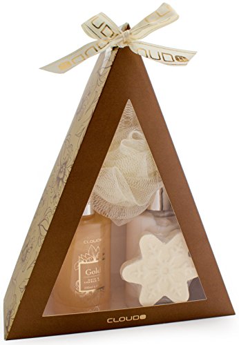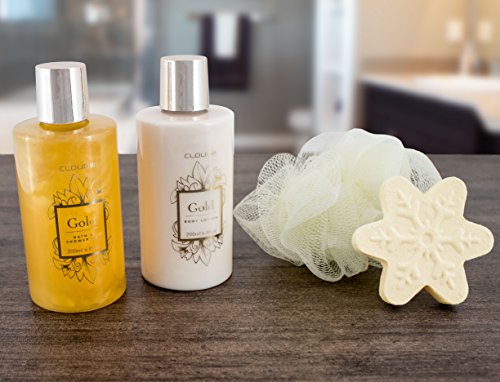 - The gift set includes 6.8 fl.oz (200 ml) shower gel, 6.8 fl.oz (200 ml) body lotion, a bath fizzer 1.5 oz. (45g) and an exfoliating sponge made of nylon.
