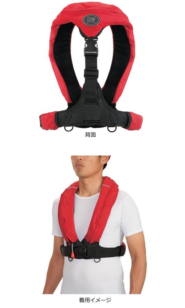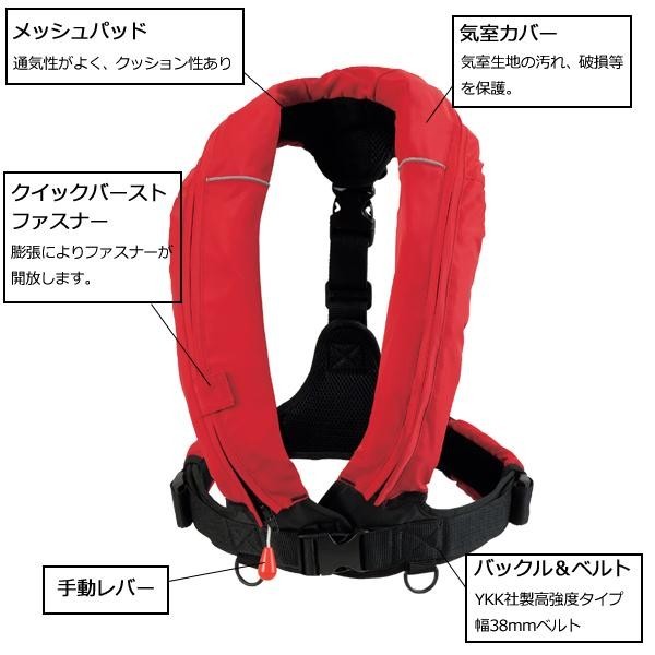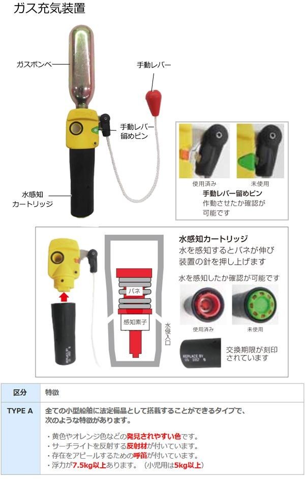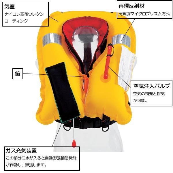 水を検知し自動膨張する補助機能付きタイプのライフジャケットです。手動も可。船舶検査対応OKです。 |