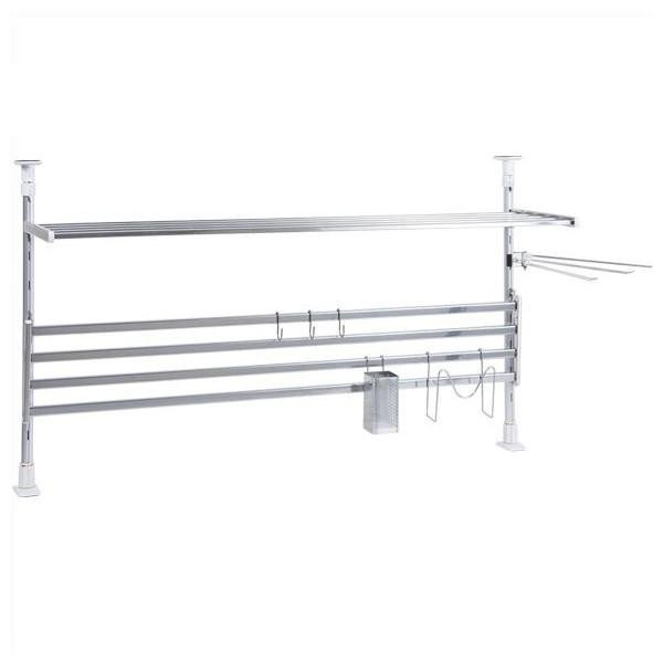 | ワンタッチの「つっぱり支柱」で取り付けも簡単!壁に傷を付けずに取付できる便利なつっぱり棚です。つっぱり支柱の高さは55~90cmの間で調節できます。ふきん掛け、フック、角ポケット、まな板受けもセットになっているので、台所まわりがすっきり片付きます♪ |