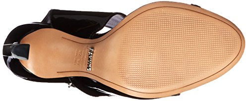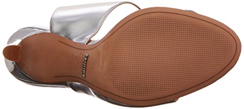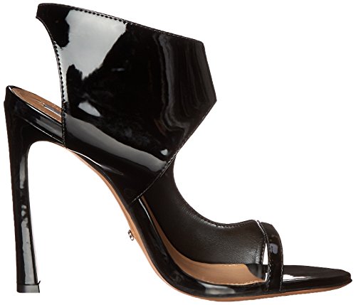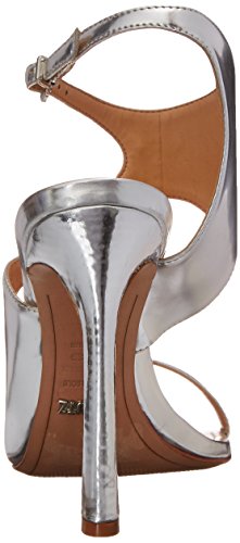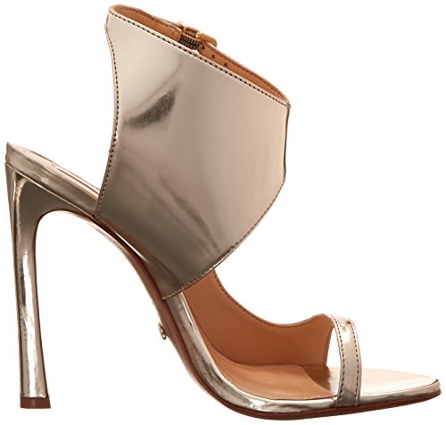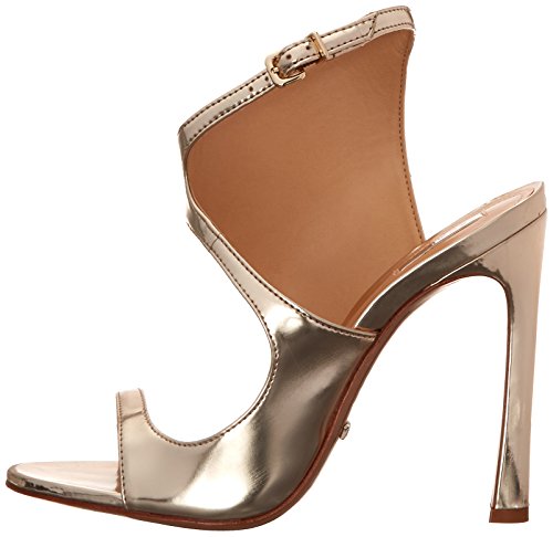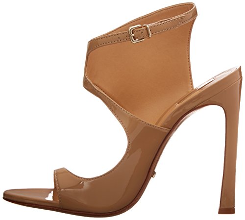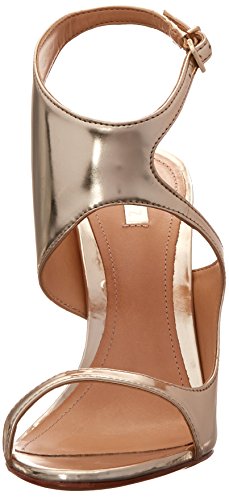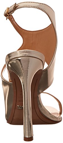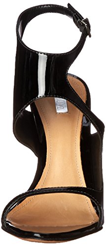 Open-toe dress sandal featuring asymmetric upper with curved lines and shapely covered heel
