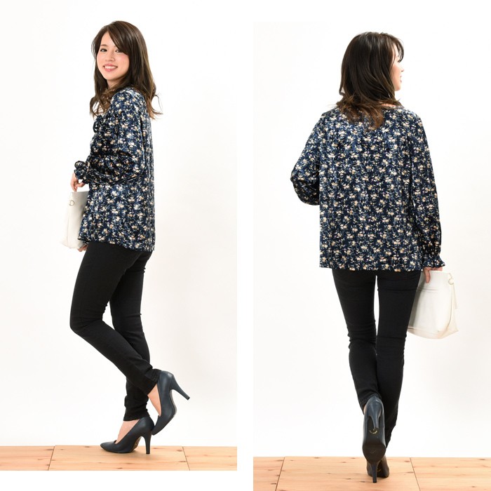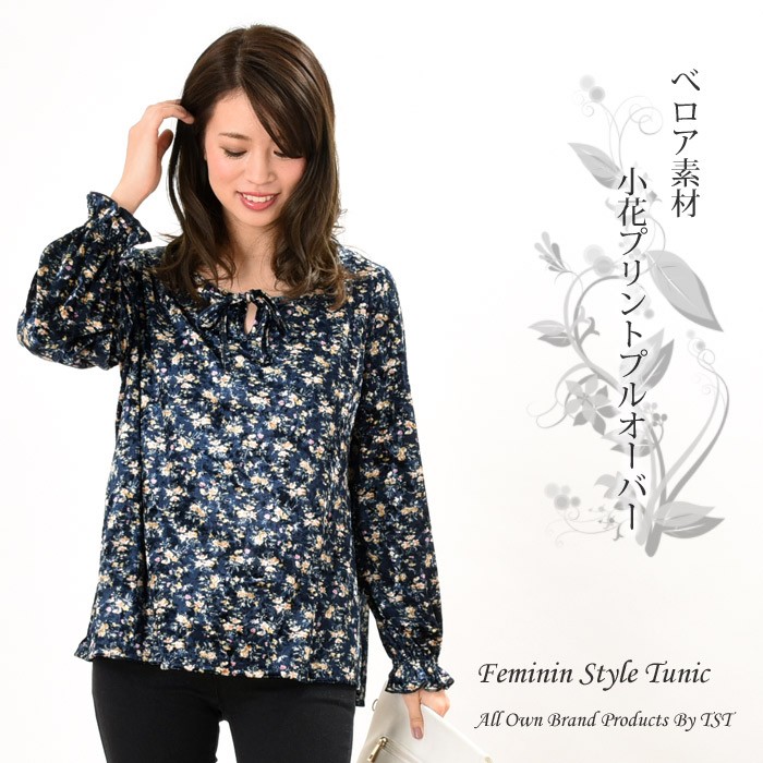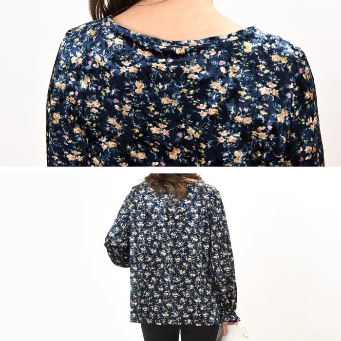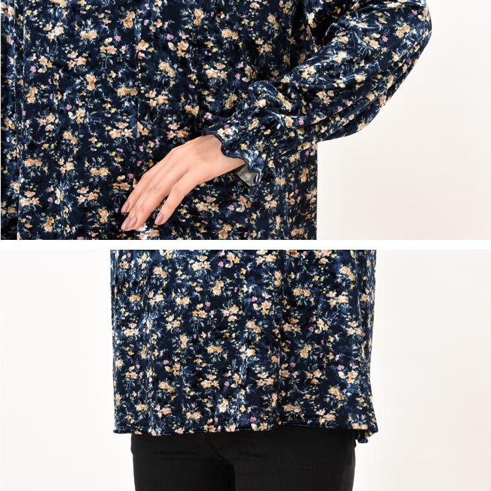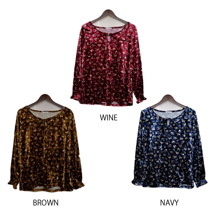ふんわりと肌触りなめらかで光沢感があり、暖かさもしっかりあるべロア素材のプルオーバーです。袖部分がキュッと絞ったようなデザインで大人フェミニンな雰囲気に仕上がるプルオーバーです。シンプルすぎず存在感もあるので、幅広い年齢層の方に人気が高くコーディネートに取り入れやすいデザインです。コーディネートのポイントになるような鮮やかな花柄はシンプルなボトムスと相性抜群です♪Mサイズ Lサイズ