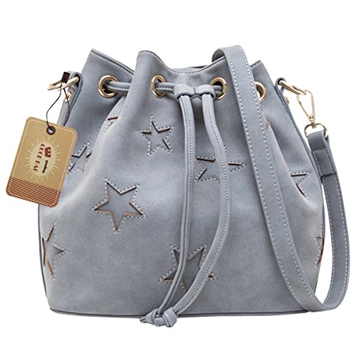 -. Feature : Bag Dimension (L*W*H): 22*13.5*22cm/8.7*5.3*8.7in, large capacity / Materials: classy faux leather and lined with soft polyester cloth / Classic barrel shape, smooth curved outlines, solid grey color, innovative minimalist design, presents an elegant and gentle sense; embossing 5-pointed star pattern, mix with some sweetness and brightness. / Drawstring and magnetic button closure, strong PU string through the metal-bordered holes, secure and handy; barrel shaped large capacity design, more spacious than others; a secret zipper pocket for your small items, roomy enough for cell phone, makeup case, wallet, etc. / Detachable shoulder strap with an adjustable buckle, convertible design, can be used as a handbag, a shoulder bag or crossbody bag, a pretty versatile bag for girl and ladies; anti-abrasion design, time-texted quality, ideal for shopping, dating, travelling, parties and workplace.